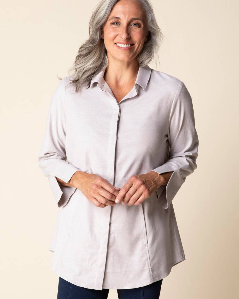 The ultimate travel companion that works as hard as you do. This relaxed-fit shirt features a hidden placket button-down for a polished look without the fuss, paired with an A-line silhouette that flatters every frame. Cuffs with slits offer versatile styling—roll them up for casual days or keep them down for refined occasions. From airport to dinner, this wardrobe essential transitions seamlessly through your journey. Pack light, look effortless. Available in Oatmeal.