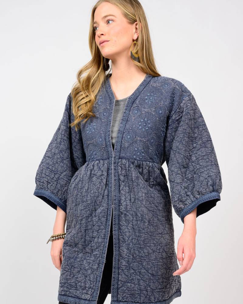 This quilted embroidered denim jacket from Ivy Jane features a charming puffed design and a secure hook and eye front closure. Tailored to fit true to size, it combines stylish detailing with comfortable wear, making it a versatile addition to your wardrobe for both casual and elevated looks.