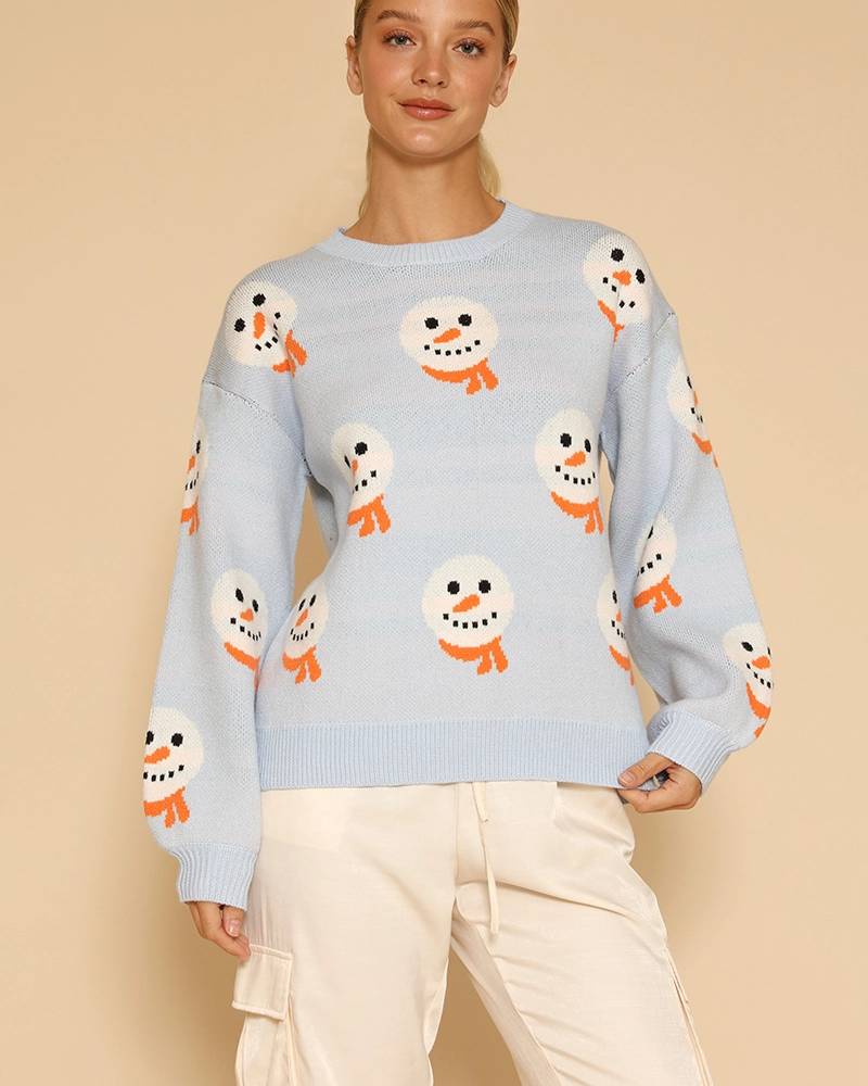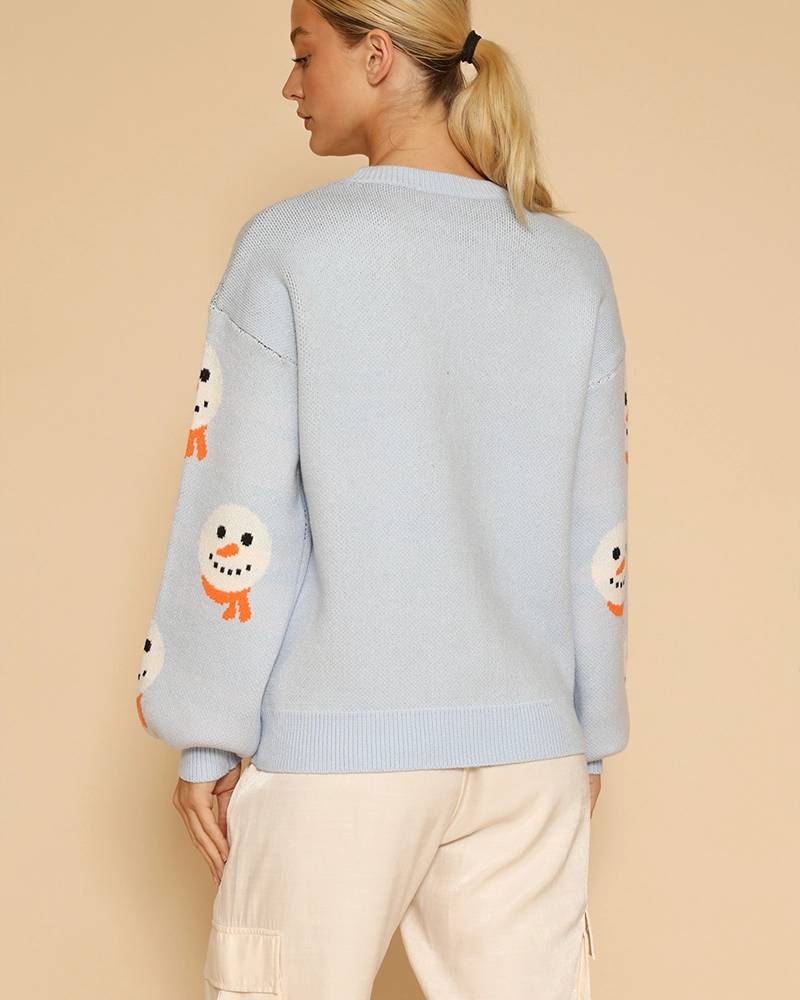Embrace the season with this charming knit sweater, featuring an all-over snowman intarsia design that captures holiday spirit. The soft, stretchy fabric moves with you while maintaining its shape, and the gently rounded neckline pairs perfectly with playful bubble sleeves for a contemporary silhouette. Crafted in an original design, this true-to-size sweater delivers both comfort and festive flair. An expert choice for anyone seeking quality knitwear with personality.