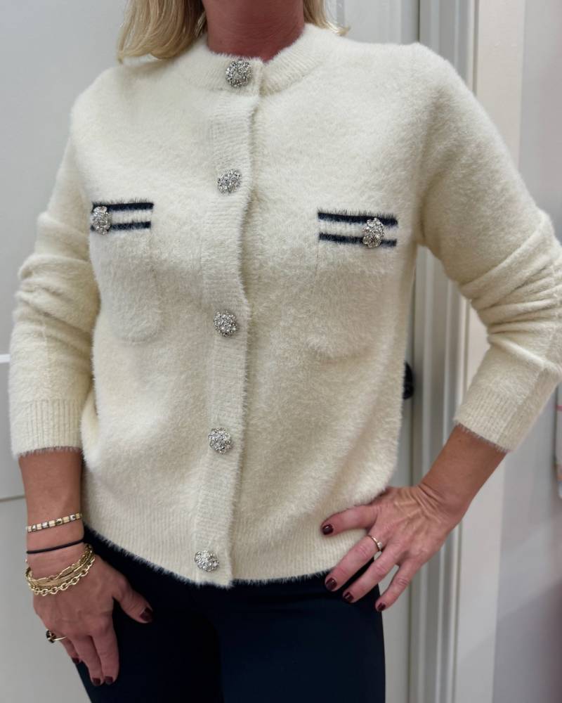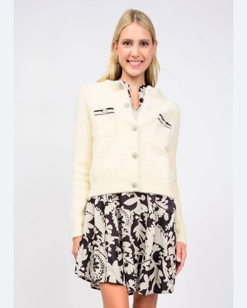 Wrap yourself in luxury with this exquisite Ivy Jane cardigan, crafted from irresistibly soft fuzzy fabric in crisp white with striking black accents. Featuring long sleeves, a classic front button closure, and functional front pockets, this piece combines timeless elegance with everyday practicality. The standout sparkly buttons add a touch of refined glamour to an otherwise understated silhouette. Cut to fit true to size, this cardigan transitions seamlessly from casual lounging to polished layering, making it an essential addition to any sophisticated wardrobe.