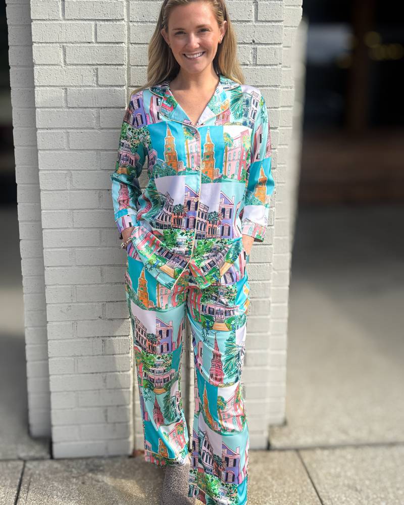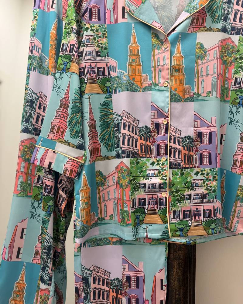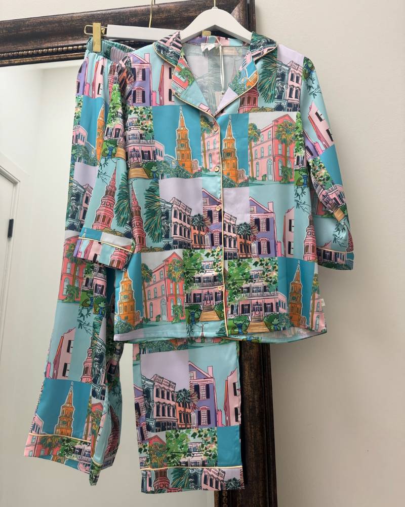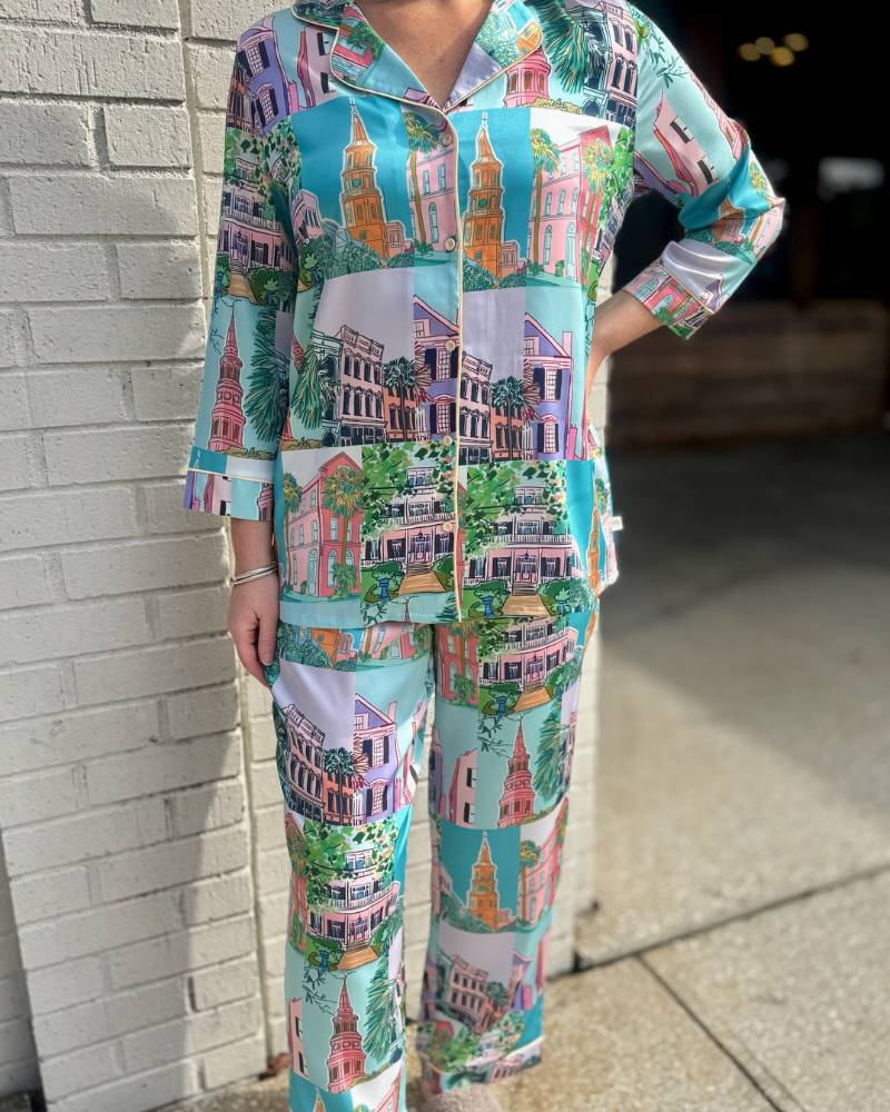 Wake up your sleepwear game with this playful Charleston Pop Crop PJ Set from local brand Imbali Charleston. Featuring a vibrant pop art illustration of downtown Charleston by artist Jessie Reyna, these cropped pants and 3/4 sleeve top deliver serious style for your downtime. The silky-smooth satin-like fabric feels as good as it looks, while practical pockets keep your essentials close. True-to-size fit ensures comfort all night long. Complete the vibe by pairing with the matching Charleston Pop Robe for an Instagram-worthy loungewear moment.