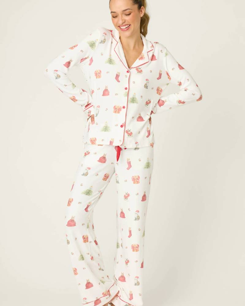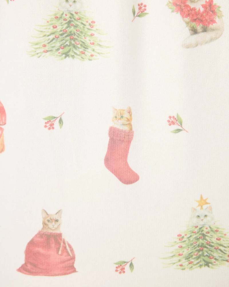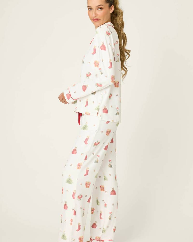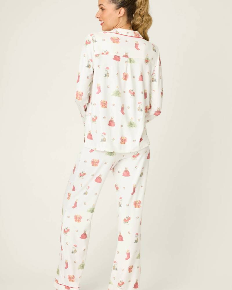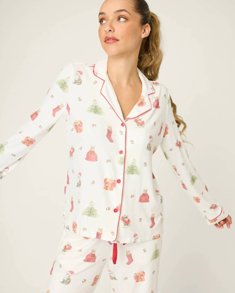 Feel-ine festive this holiday season in butter-soft jersey pajamas scattered with merry little cats—popping out of stockings, hiding in gift bags, or doubling as Christmas trees. The button-down top gets a cheery finish with red piping and buttons, while the relaxed pants tie at the waist with a bright contrast drawstring. Made for curling up with cocoa, holiday movie marathons, and catnaps that last all afternoon.