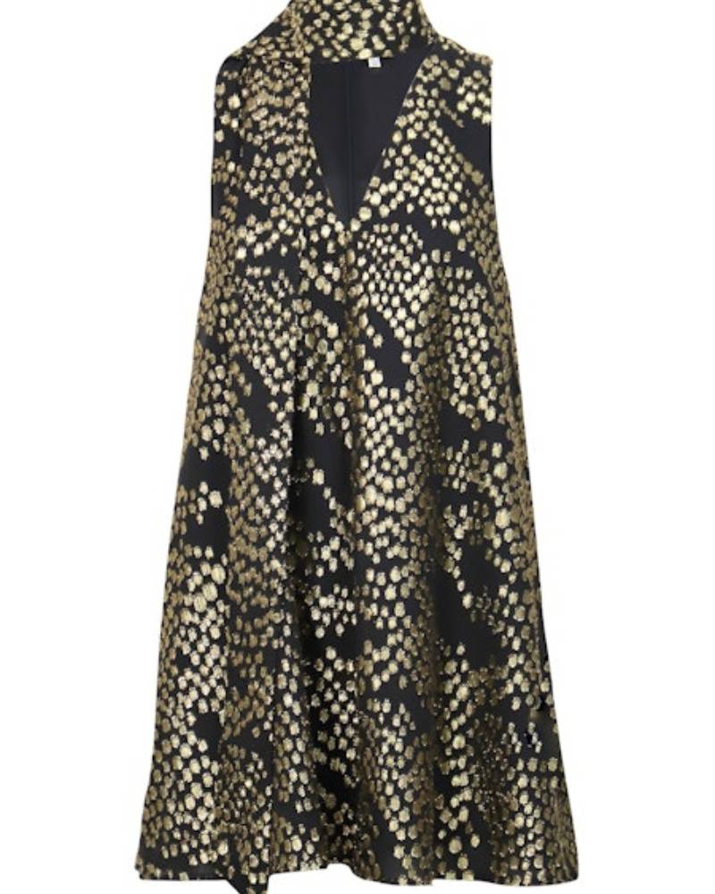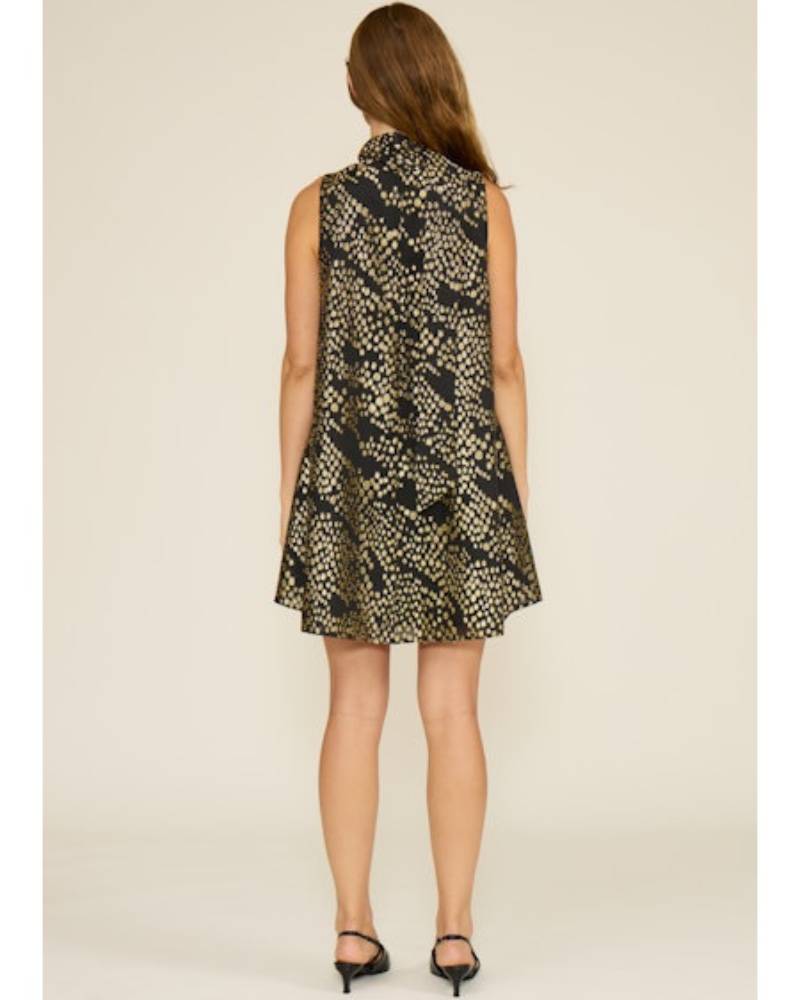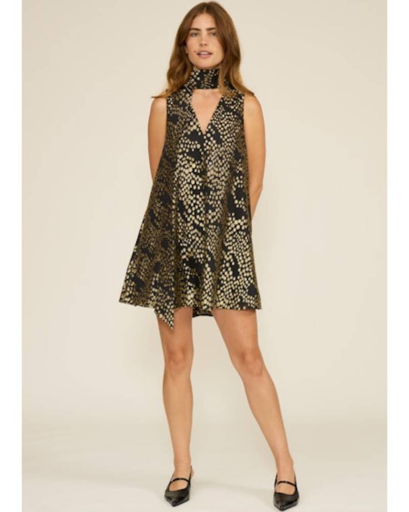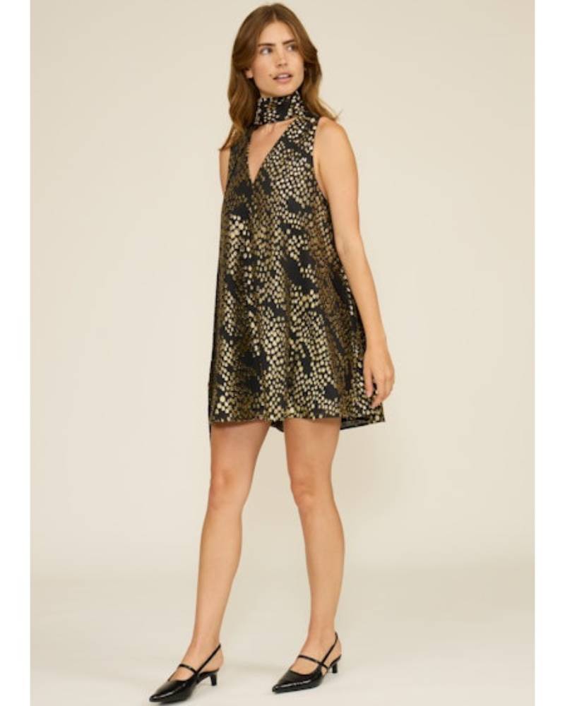 Ring in the new year in style with the Monica Scarf Dress from Lucy Paris. This chic mini dress features a sleek black silhouette elevated by shimmering gold metallic accents that catch the light beautifully. The removeable scarf adds versatility—wear it draped for extra glamour or detach it for a streamlined look. Perfect for New Year's Eve celebrations, holiday parties, or any occasion calling for effortless elegance with a playful twist.