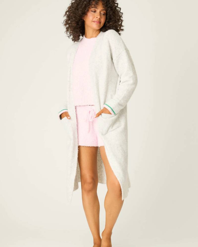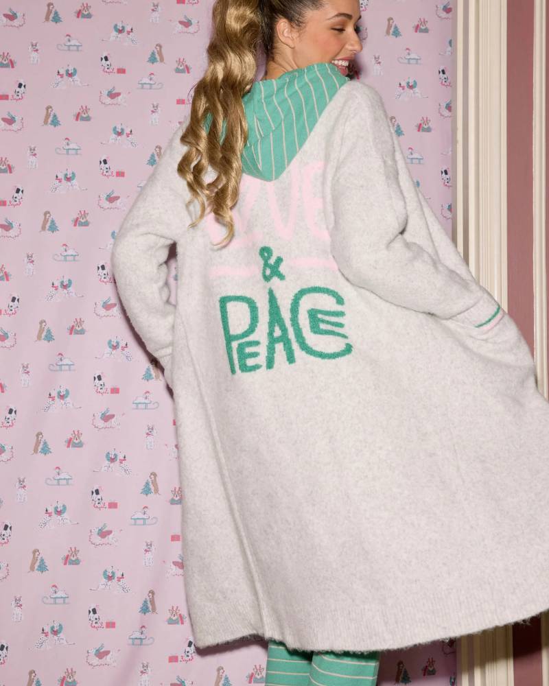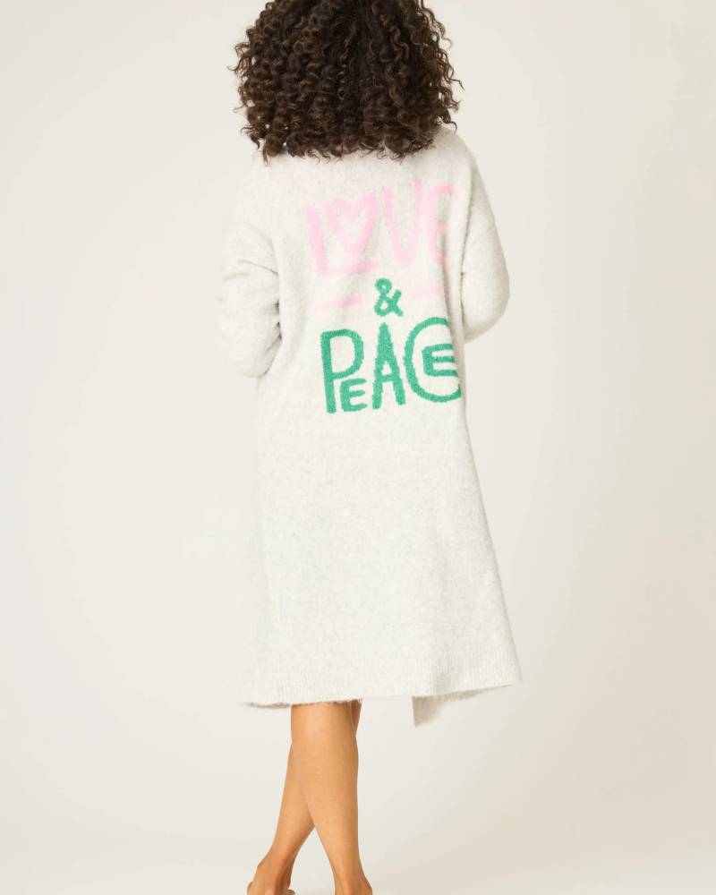 Wrap yourself in good vibes with this heathered cardigan that's basically a hug you can wear. Crafted from impossibly soft sweater knit, it features an open-front design perfect for layering over your favorite loungewear. The real magic? A bold "love & peace" graphic splashed across the back, paired with charming pink-and-green trimmed cuffs and functional pockets. Whether you're settling in for a cozy night or spreading holiday cheer, this cardigan delivers comfort with a side of feel-good style.