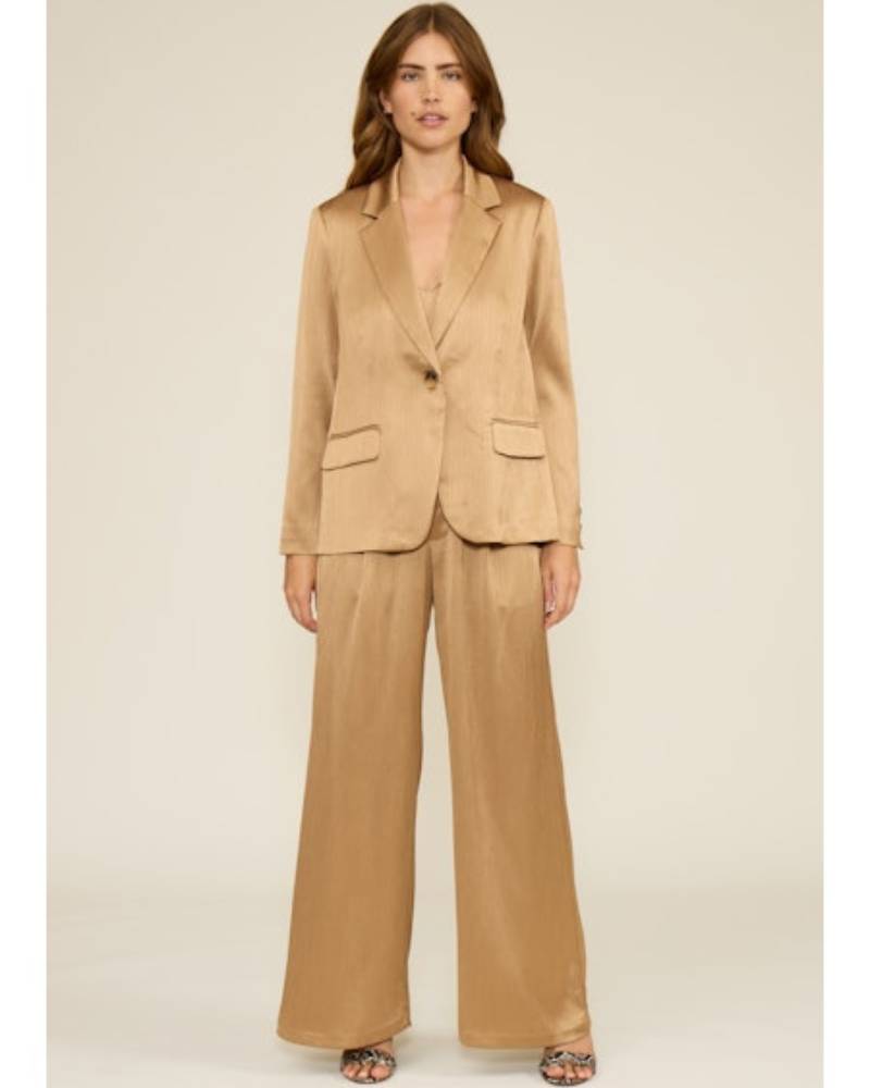 Elevate your holiday look with these stunning Robbie Textured Satin Pants from Lucy Paris. Crafted in luxurious pale gold metallic satin, these wide-leg beauties deliver effortless elegance for festive celebrations. The fluid drape and shimmering finish make them a showstopper, while the true-to-size fit ensures a flawless silhouette. Whether you're dancing the night away or mingling at cocktail hour, these pants are your ticket to feeling absolutely fabulous.
