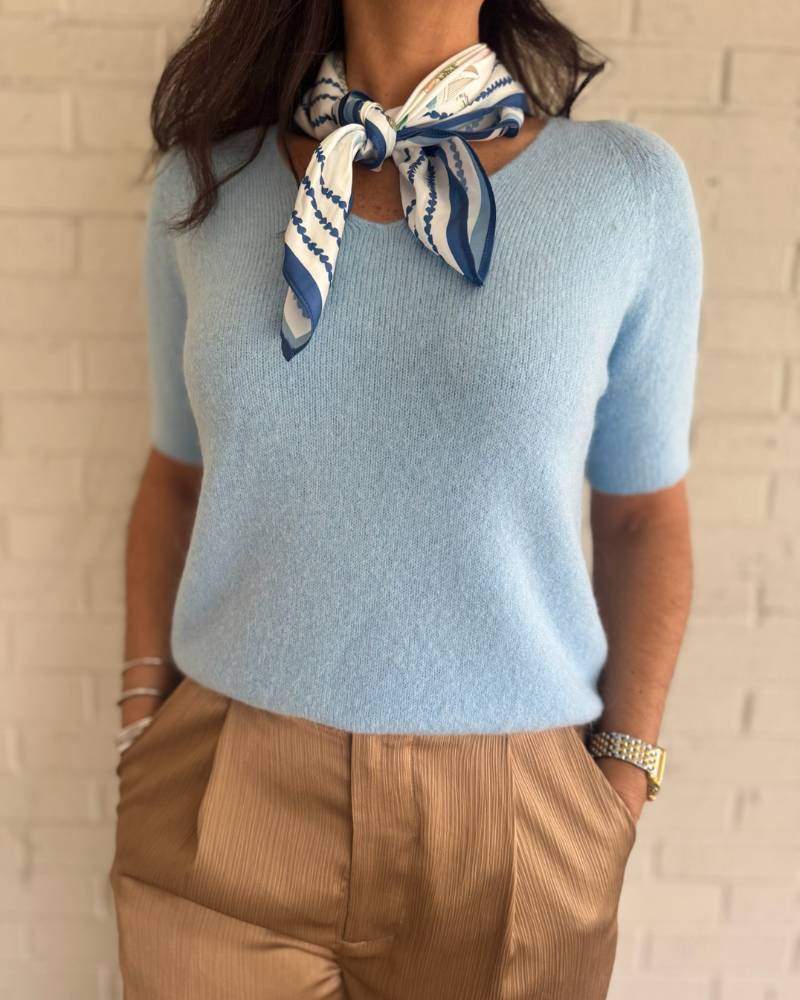 Wrap yourself in cloud-like comfort with this dreamy sky blue v-neck sweater from Scandal Italy. Crafted from super soft, slightly fuzzy fabric that feels as good as it looks, this short sleeve essential fits true to size and brings an effortless touch to any outfit. Proudly made in Italy with quality craftsmanship. Care: hand wash or dry clean to keep it looking fresh.