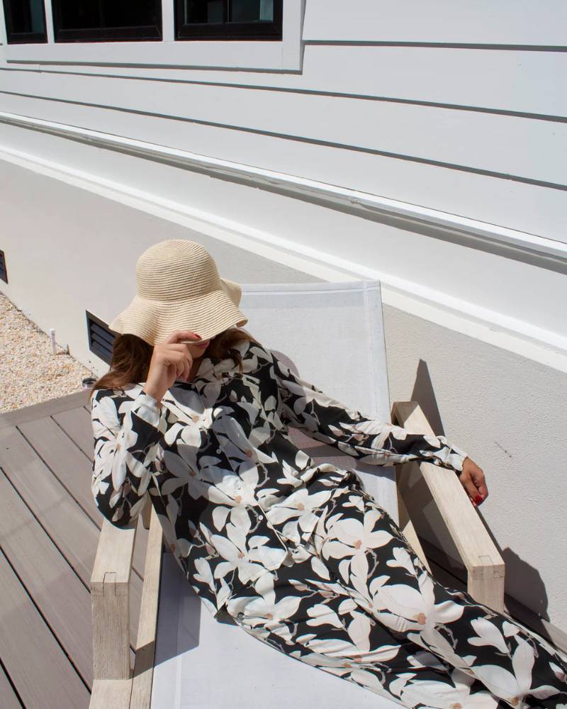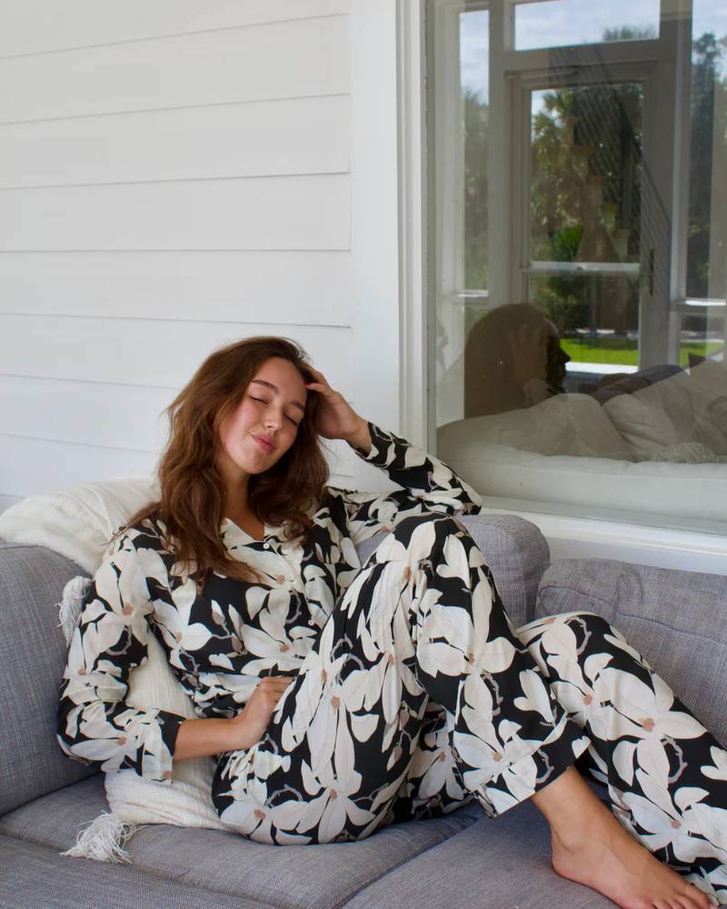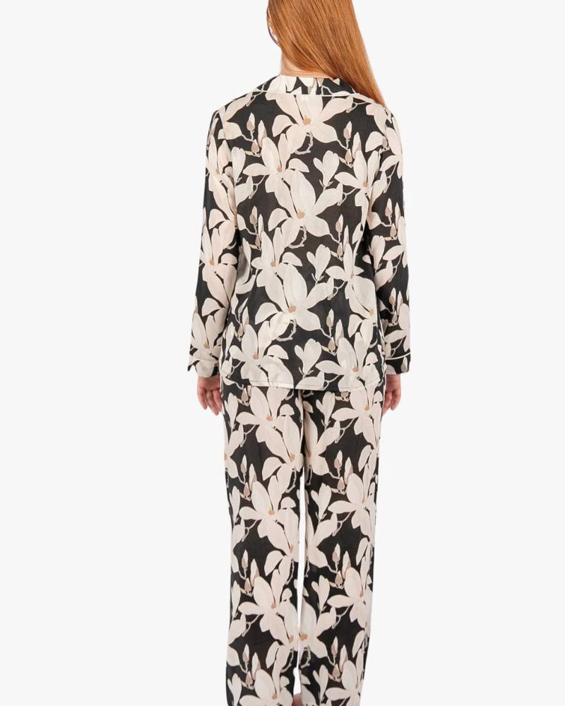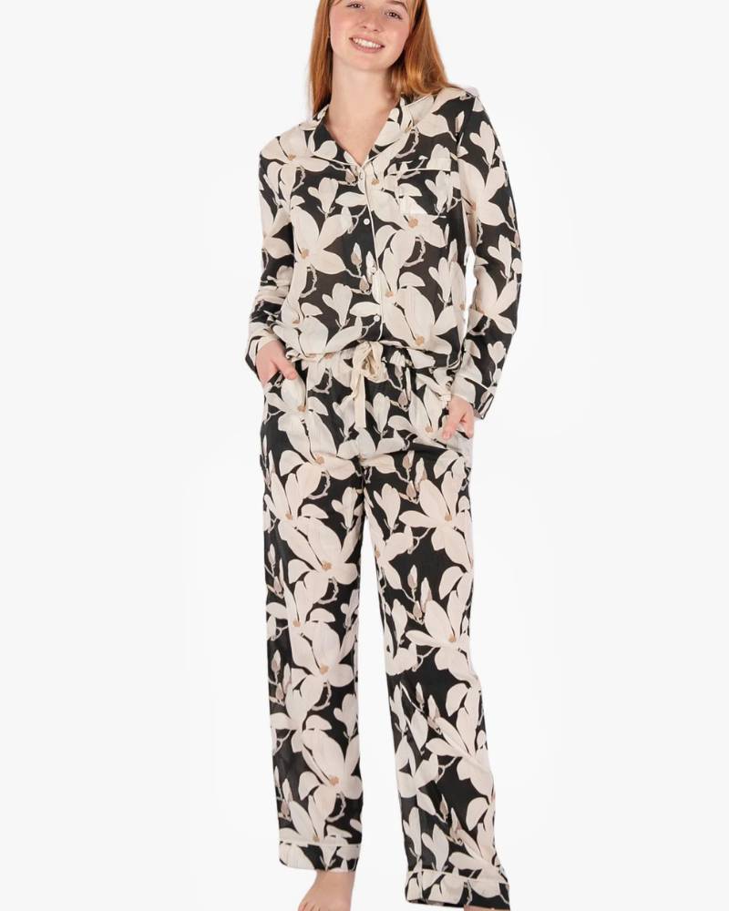 The Midnight Magnolia Pant PJ Set from Imbali Charleston, created in collaboration with the Rijks Museum, showcases a stunning Magnolia flower motif on a lightweight woven viscose lyocell blend. This fabric ensures durability, breathability, and strength for lasting comfort. The set features contrast binding on the pocket, full-length sleeves with cuffs, practical pants pockets, and a decorative waistband. It also includes a reusable self-fabricated bag with a satin drawstring for storage. Easy to care for, it’s machine washable on a gentle cycle with cold water and requires no tumble drying.