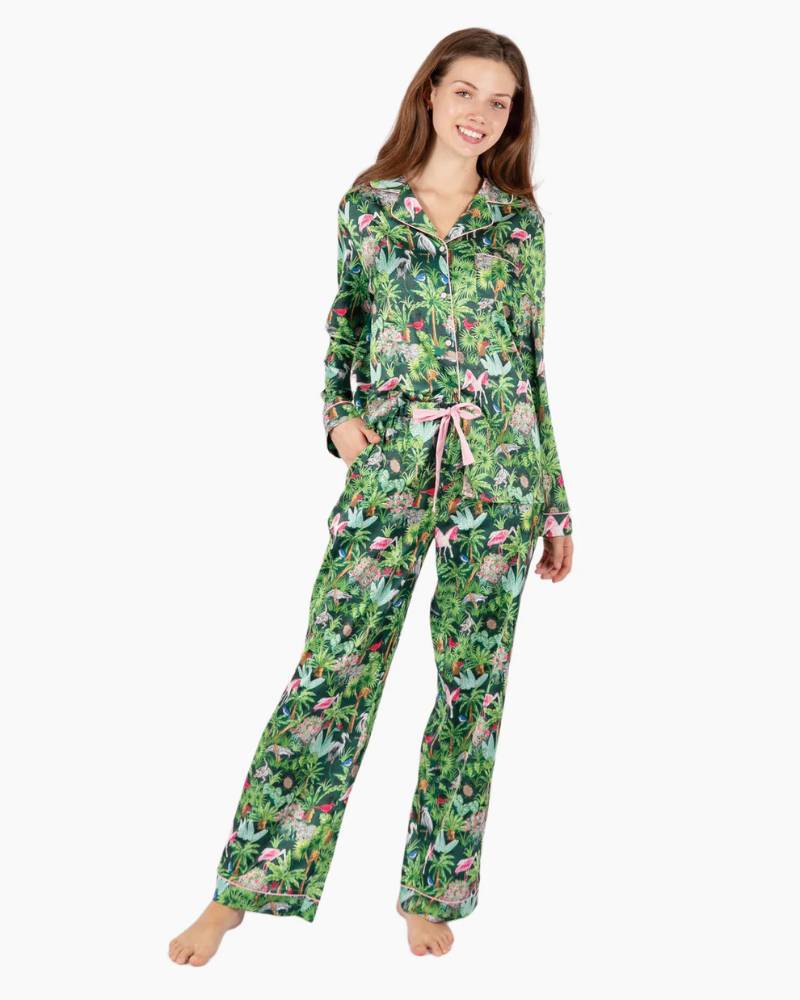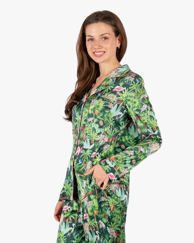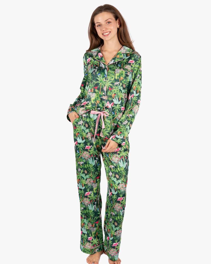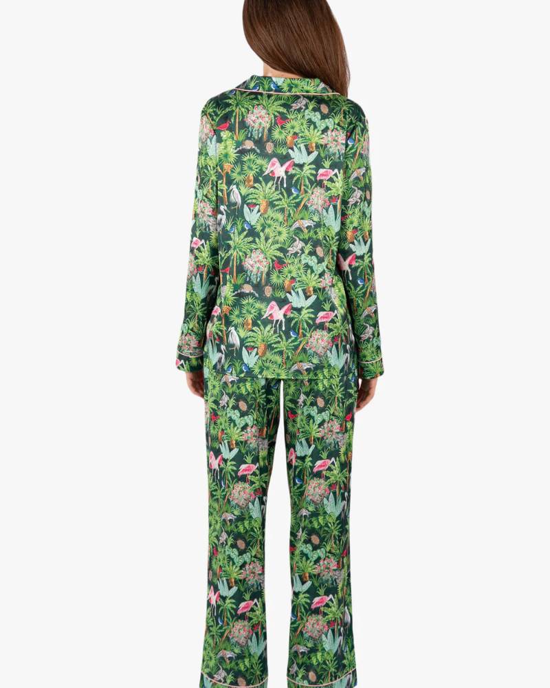 Experience the Mystic Marsh Pant PJ Set from Imbali Charleston, featuring an intricate, hand-painted design by artist Laurie Hibbert inspired by Southern fauna, flora, and wildlife. Crafted in luxurious satin, the set highlights contrast binding on the pocket, sleeve, and cuff, with functional pockets and a decorative waistband tie for added comfort and style. It includes a self-fabricated, reusable satin drawstring bag for convenient storage. Machine washable on a gentle cycle, this PJ set combines artistic elegance with practical wearability, perfect for those who appreciate refined, nature-inspired loungewear.
