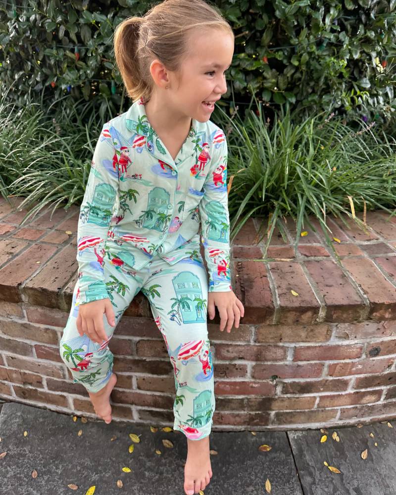 Cozy up this holiday season with the Santa in Charleston Kids PJ Set from Imbali! Featuring a whimsical Southern Christmas print, this adorable two-piece set includes a long-sleeve top with contrast binding and pants complete with functional pockets and a decorative waistband tie. Crafted from soft, smooth fabric with just the right amount of stretch, these pajamas deliver all-day comfort. Comes beautifully packaged in a reusable satin-drawstring bag—ready to delight as a gift or keep for yourself!