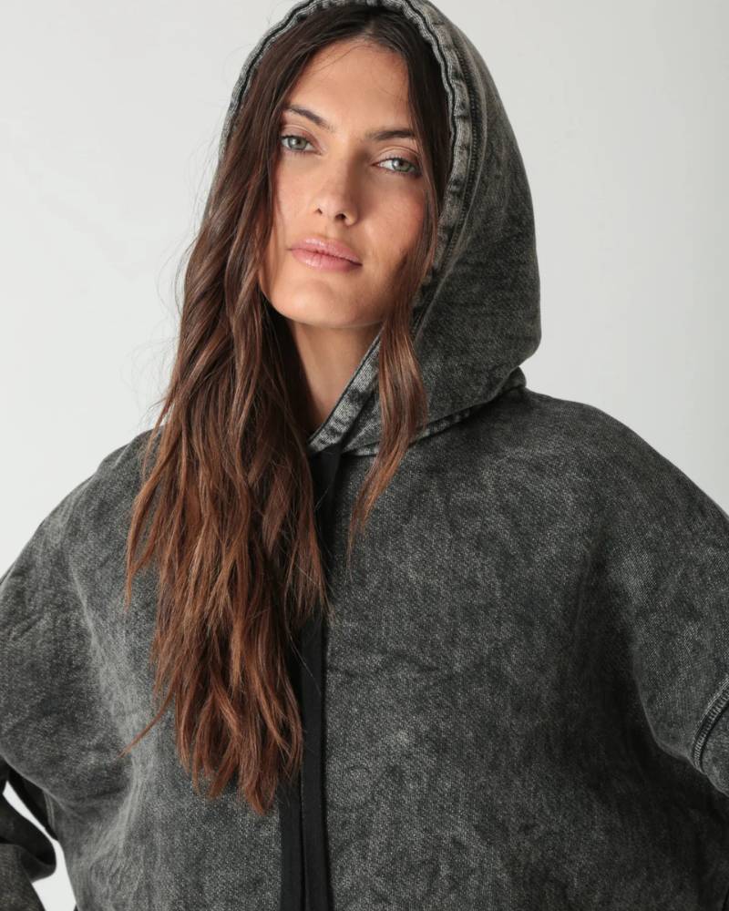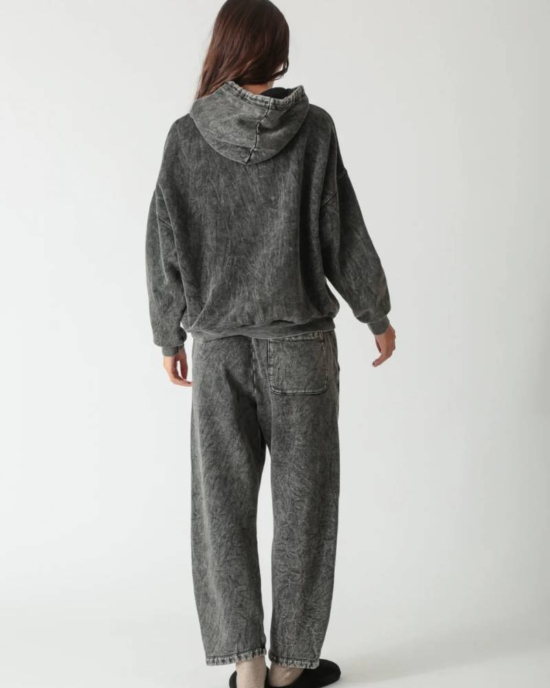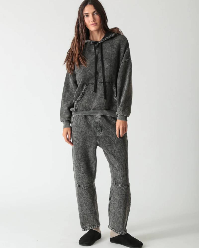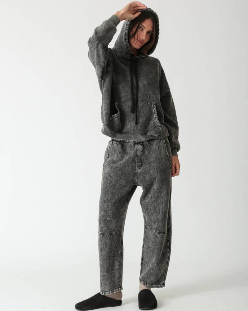 Meet your new favorite way to lounge. The Taylor hoodie features an oversized boyfriend fit with natural twill drawcords and a cozy kangaroo pocket, while the Barrel sweatpant delivers that perfect balance of dressed-up comfort in our signature chunky fleece. Both pieces are crafted from 100% cotton and hand-dyed in our exclusive acid onyx colorway right here in Los Angeles. Together, they're the ultimate laid-back-but-make-it-chic combo that's already winning hearts everywhere. Erin's favorite pieces to travel in.