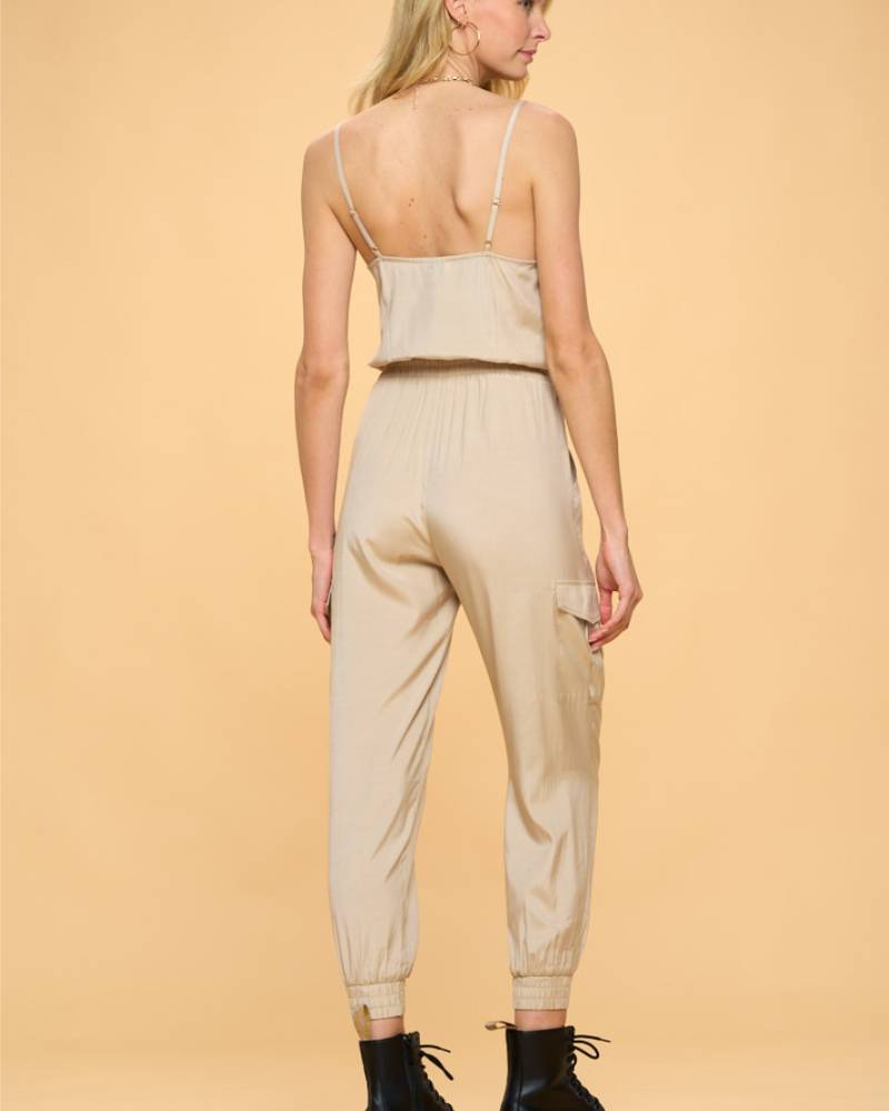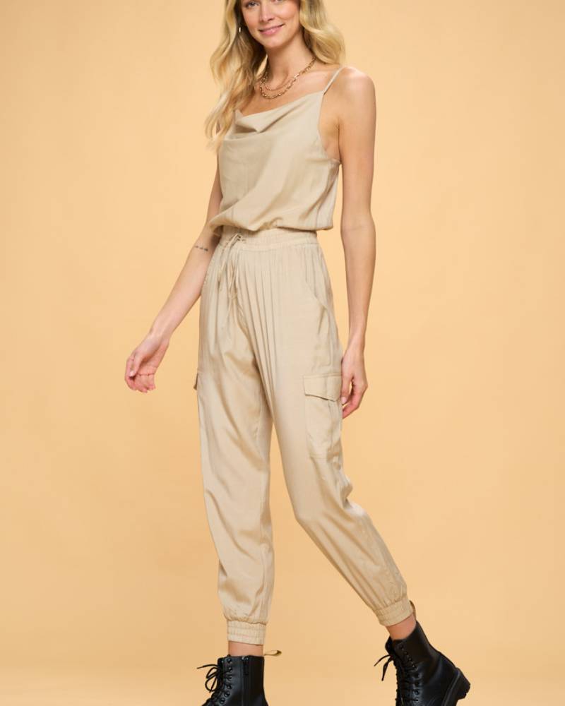 Stay chic and effortlessly stylish in our Cowl Neck Sleeveless Jumpsuit. With a unique cowl neck design and comfortable sleeveless fit, this jumpsuit is perfect for any occasion. Features side pockets and cargo pockets for added convenience. Made with a soft and lightweight fabric blend, it fits true to size for maximum comfort. (Model wears size small.)