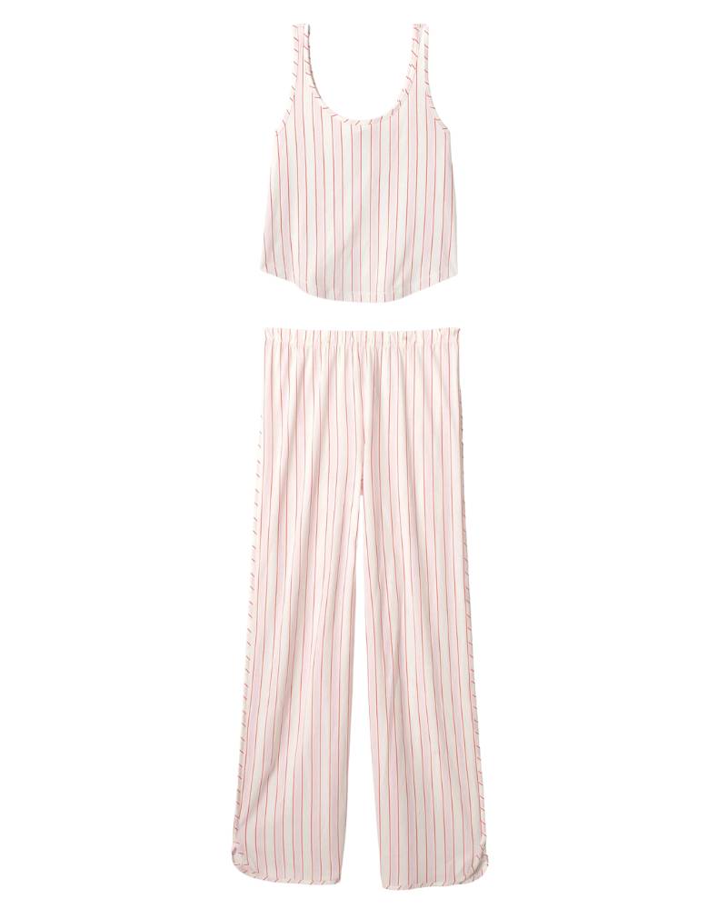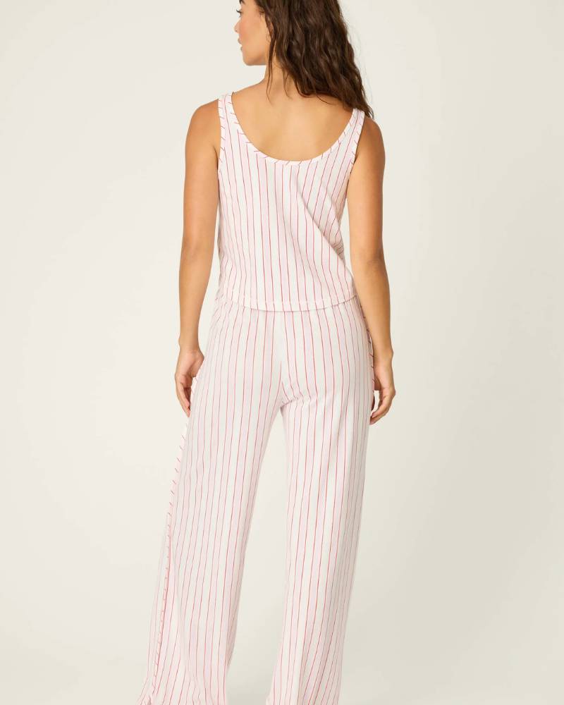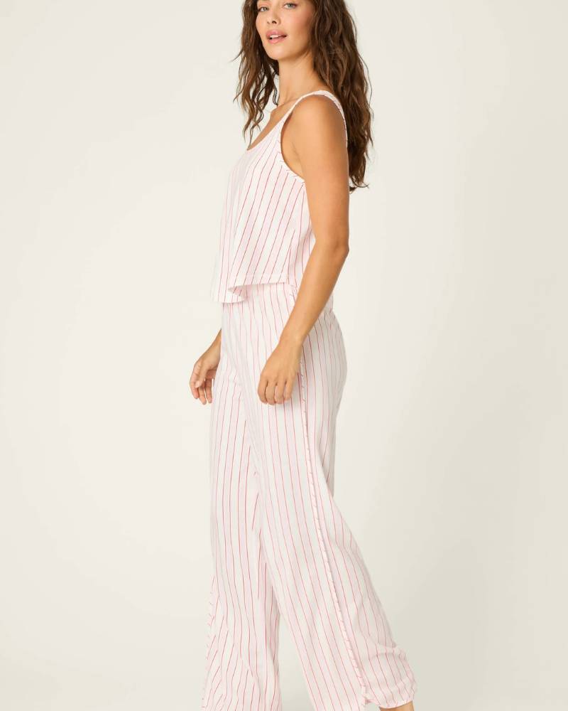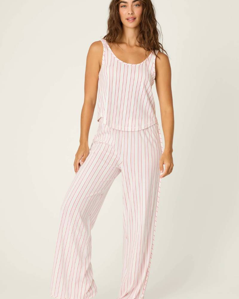 Snuggle up in style with this charming striped pajama set from PJ Salvage. Featuring cheerful ivory, red, and pink stripes, the soft cotton-modal jersey blend hugs your skin with luxurious comfort. The scoop-neck tank pairs perfectly with relaxed open-leg pants, creating an effortlessly cute look that transitions seamlessly from bedtime to lazy mornings. Cozy never looked so good.