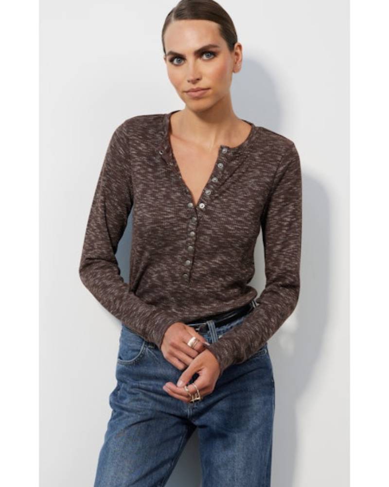 The Long Sleeve Slim Snap Tee from Bobi delivers understated sophistication with its streamlined silhouette and functional snap button front. Crafted from a luxuriously soft fabric with subtle stretch, this piece offers comfort without excess give. The Heather Brown colorway pairs effortlessly with denim, black pants, or brown trousers for versatile everyday styling. True to size, it's an essential layering piece that transitions seamlessly from casual to polished looks.
