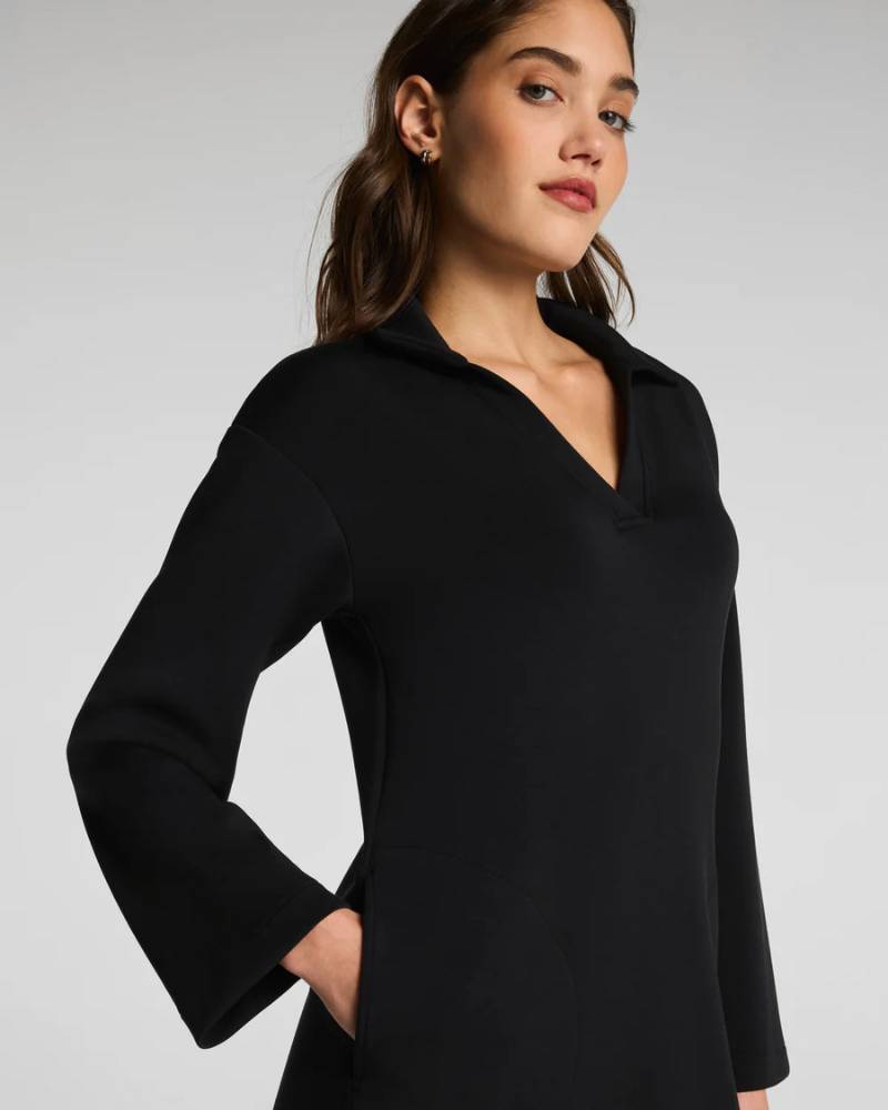 The SPANX AirEssentials® Polo Long Sleeve Dress combines effortless style with everyday comfort. Crafted from our signature spacer fabric—light-as-air, cloud-soft, and incredibly smooth—this dress features a classic collar, relaxed fit, and 4-way stretch that moves with you. Whether you're traveling, running errands, or relaxing at home, this versatile piece transitions seamlessly from day to night. Plus, built-in UPF 50+ protection shields your skin during outdoor activities. Available in Black.