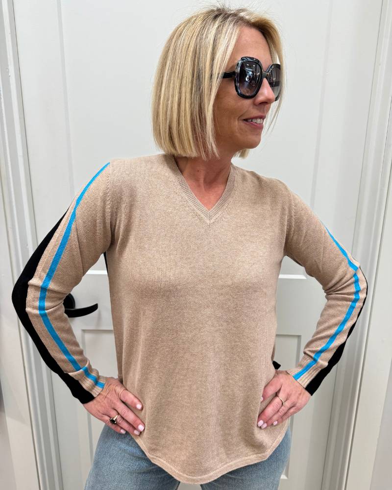 Introducing the Color Block Blue Stripe Top from Zaket & Plover—a lightweight layer that feels as good as it looks. This long sleeve sweater blends 95% cotton with 5% cashmere for a buttery-soft touch that won't weigh you down. The playful color-block design features a creamy front, sleek black back, and electric blue stripes running down the arms for that perfect pop of personality. True to size and ready for gentle care (hand wash cold, line dry), it's your new go-to for effortless style.