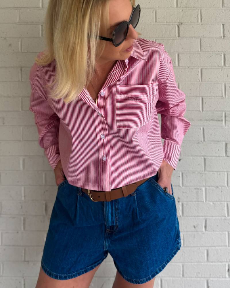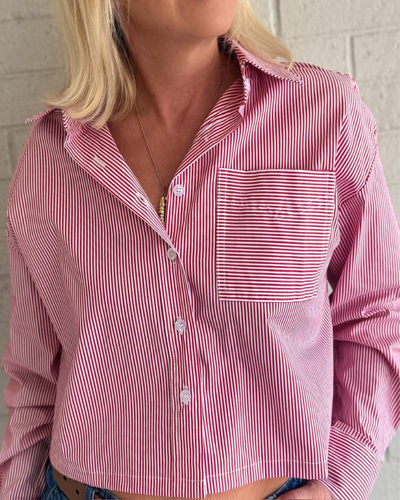 Adorable striped blouse that's ready to steal the show! This crispy cotton long sleeve features classic red and white stripes with a charming front pocket and full button-up front. The cropped length hits just right for a modern, flattering silhouette. Soft yet structured fabric keeps its shape all day long. Fits true to size. Perfect for layering or wearing solo—your new go-to piece from Elan.