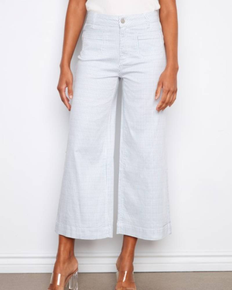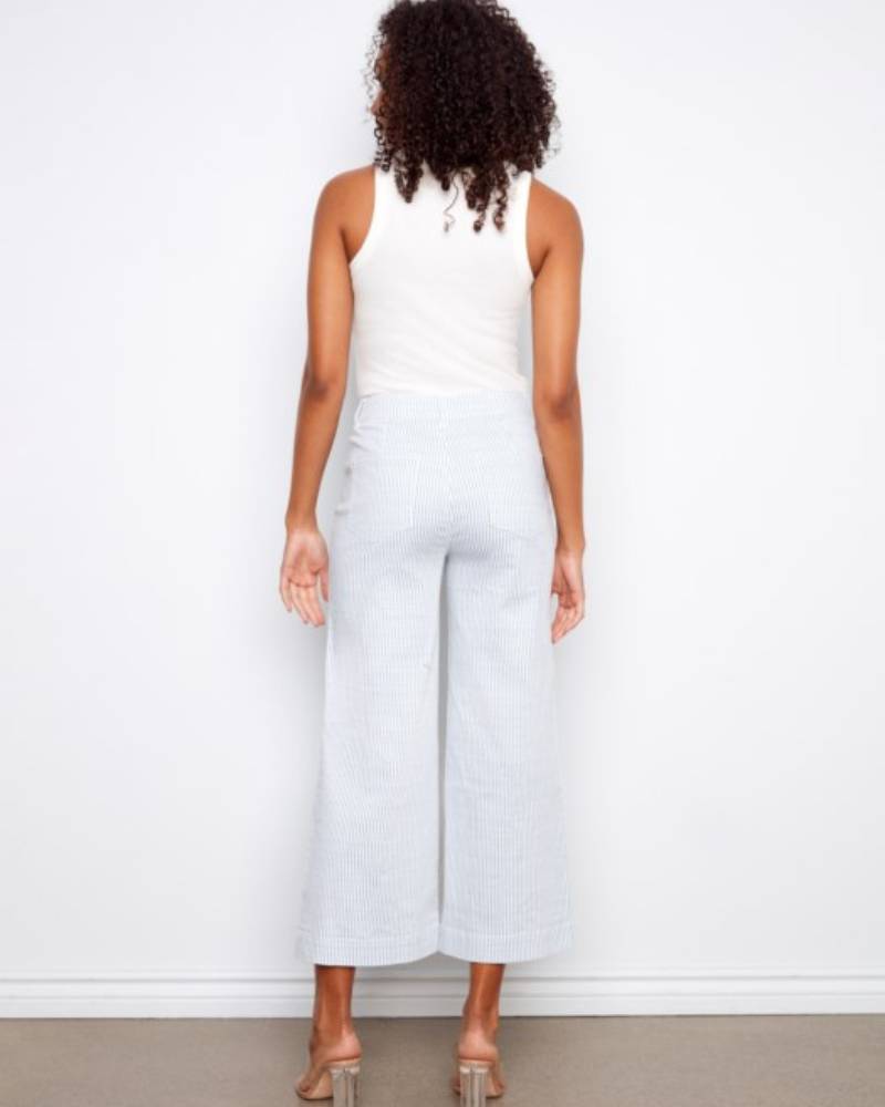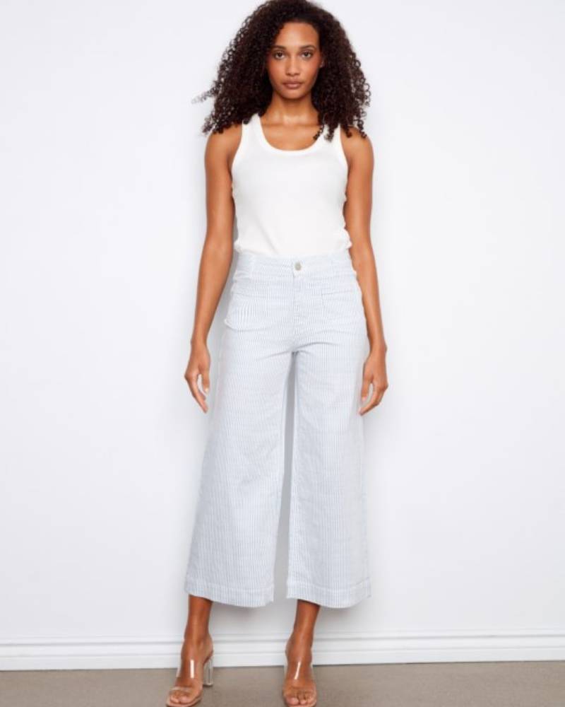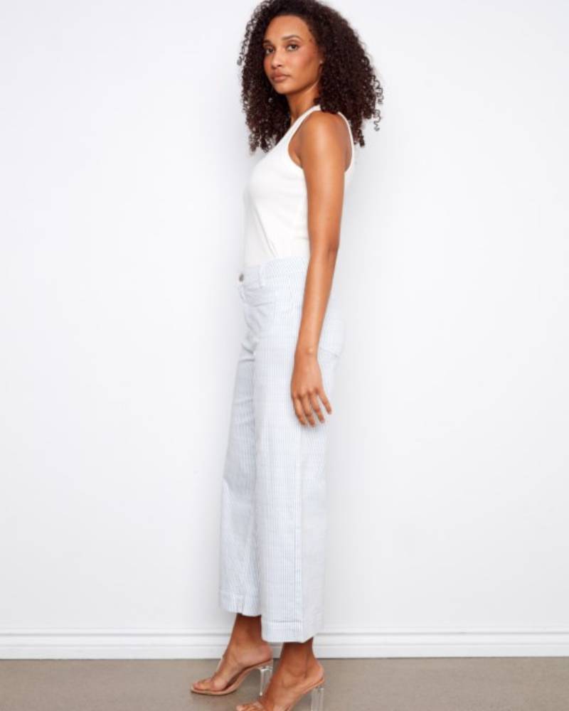 Stripes meet style in these cropped flare jeans that bring a fresh twist to your everyday rotation. Crafted from a soft cotton-spandex blend, they feature a classic white base with delicate blue stripes that add visual interest without overwhelming your look. The regular rise sits comfortably at the waist, while patch pockets keep things simple and chic. With a 27-inch inseam and 12-inch leg opening, the cropped flare silhouette hits just right—perfect for showing off your favorite sneakers or sandals. Easy care in cold water and ready to become your new go-to pair.