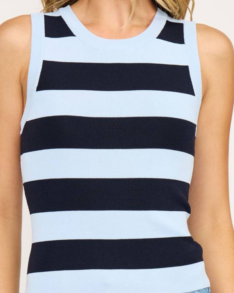 Effortless style meets comfort in this striped tank from Lucy Paris. Crafted from soft knit fabric, it features a classic crew neckline and sleeveless design that works seamlessly into any wardrobe. The fitted silhouette skims your frame for a polished, put-together look. Perfect for layering or wearing solo, this navy and pale blue striped essential transitions beautifully from season to season.