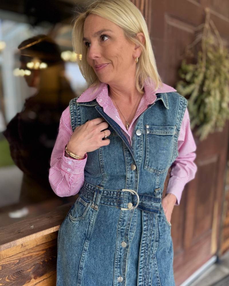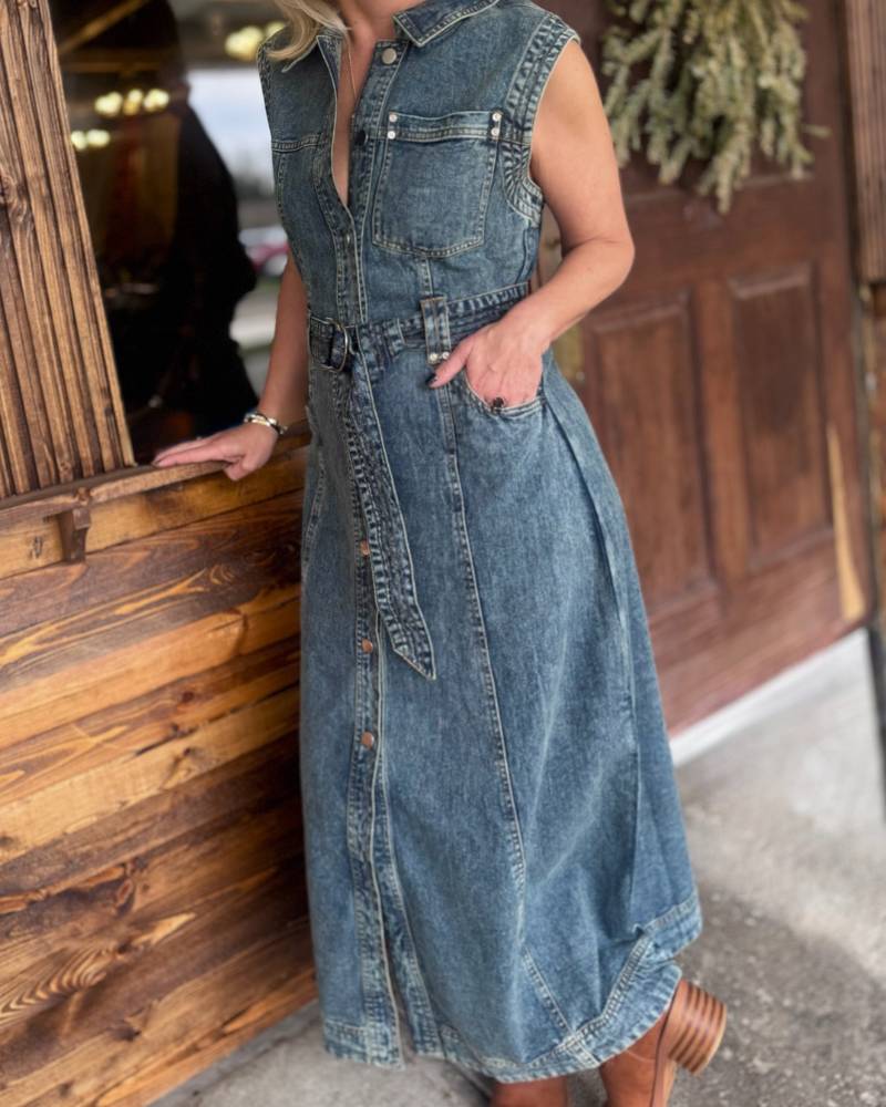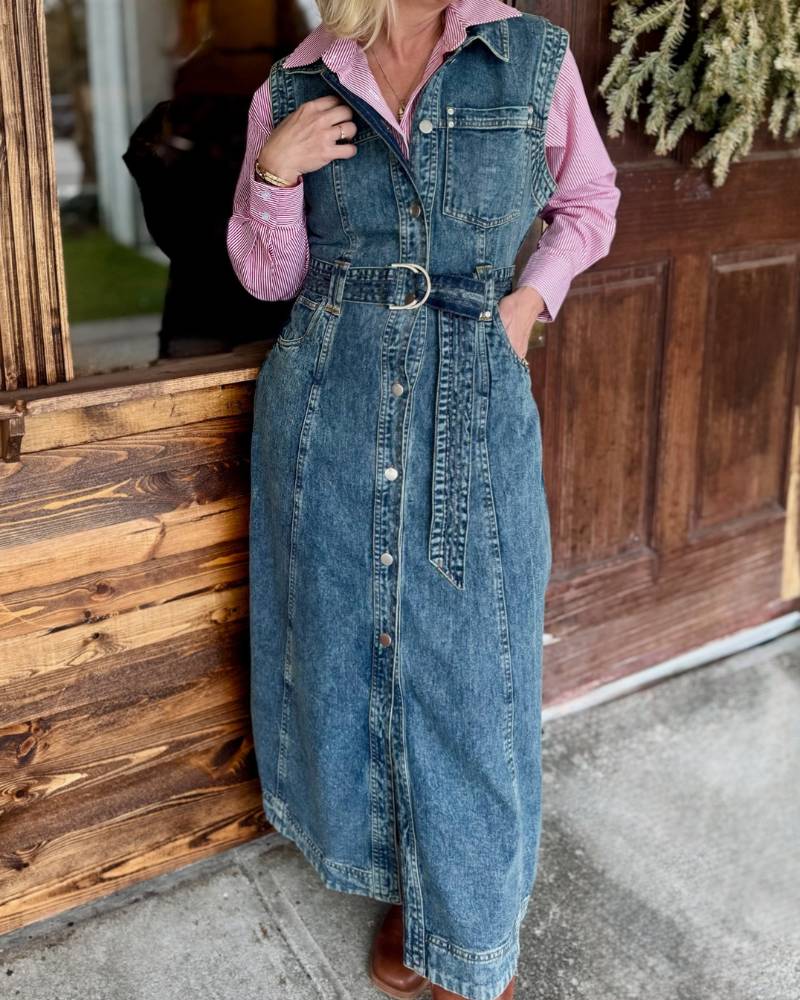 Throw on this sleeveless denim dress and you've got instant cool-girl vibes. Button it up from top to bottom for a polished look or leave a few undone for that effortlessly laid-back feel. The roomy fit means comfort without compromise, and the included denim belt lets you cinch it whenever you want. Layer a fitted tee or tank underneath for extra styling options—this dress plays well with others. Pure denim perfection.
