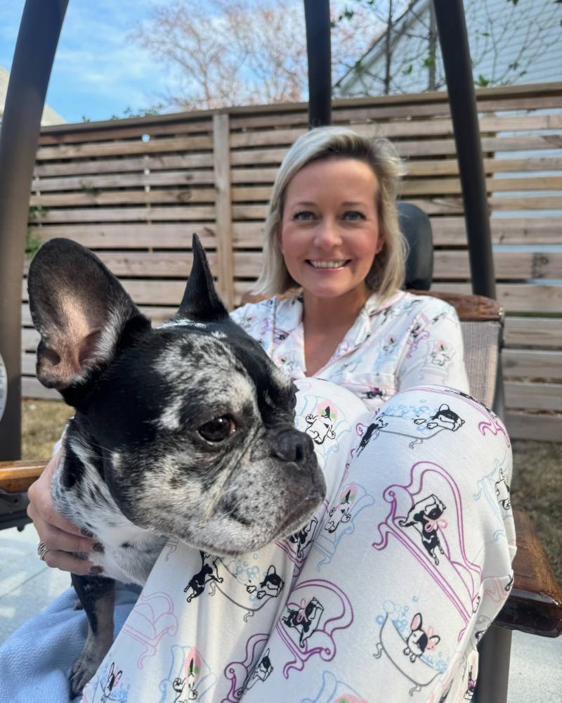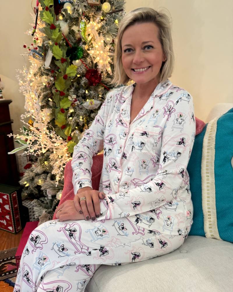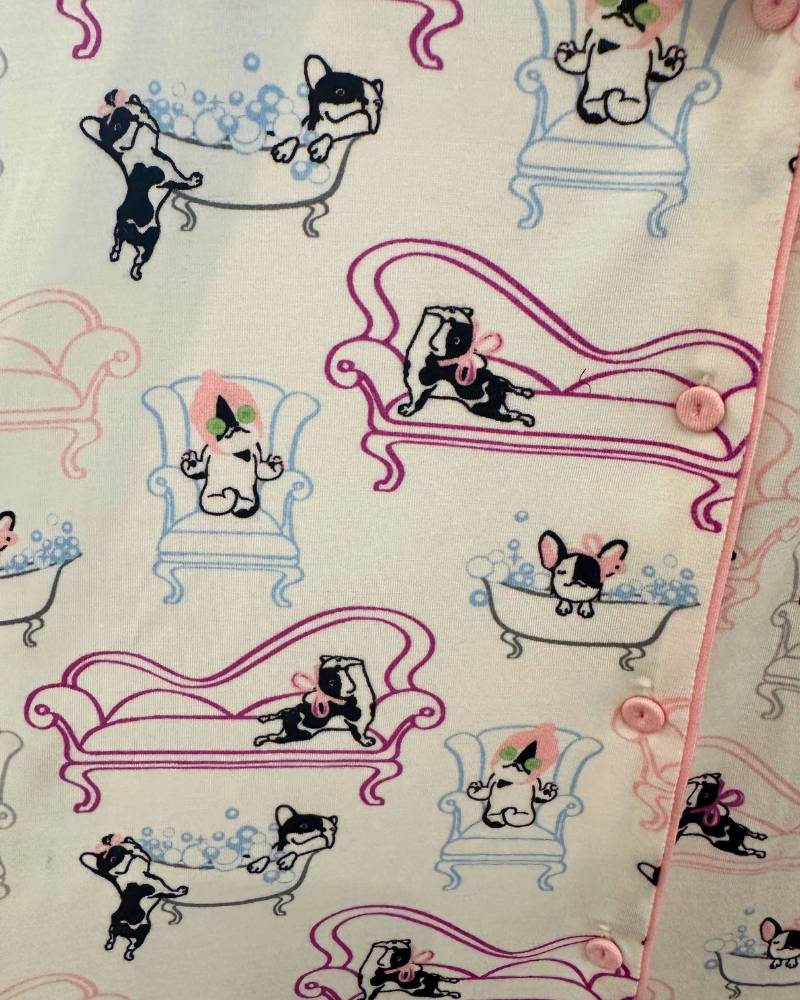 Meet your new favorite loungewear moment—the Dolly the Charleston Frenchie Pants PJ Set. This exclusive Lounge With Us collaboration with Imbali Charleston celebrates Erin's beloved frenchie, Dolly Parton, in all her glamorous glory. The ultra-soft modal fabric feels like a cloud against your skin, while the button-up long sleeve top pairs perfectly with matching pants featuring a stretchy waistband and drawstring. Pockets included, because comfort deserves functionality. Watch Dolly live her best life across the print—lounging on her chaise, soaking in the tub, and treating herself to a cucumber face mask. True to size and impossibly soft, this set is your ticket to cozy elegance.