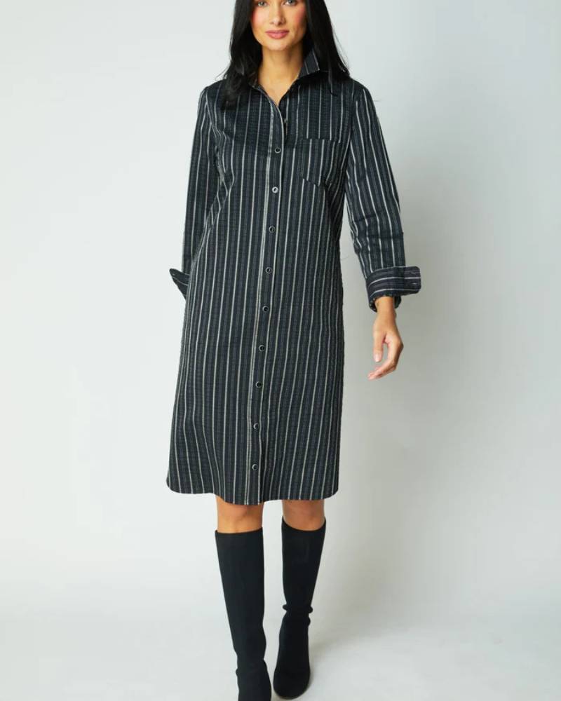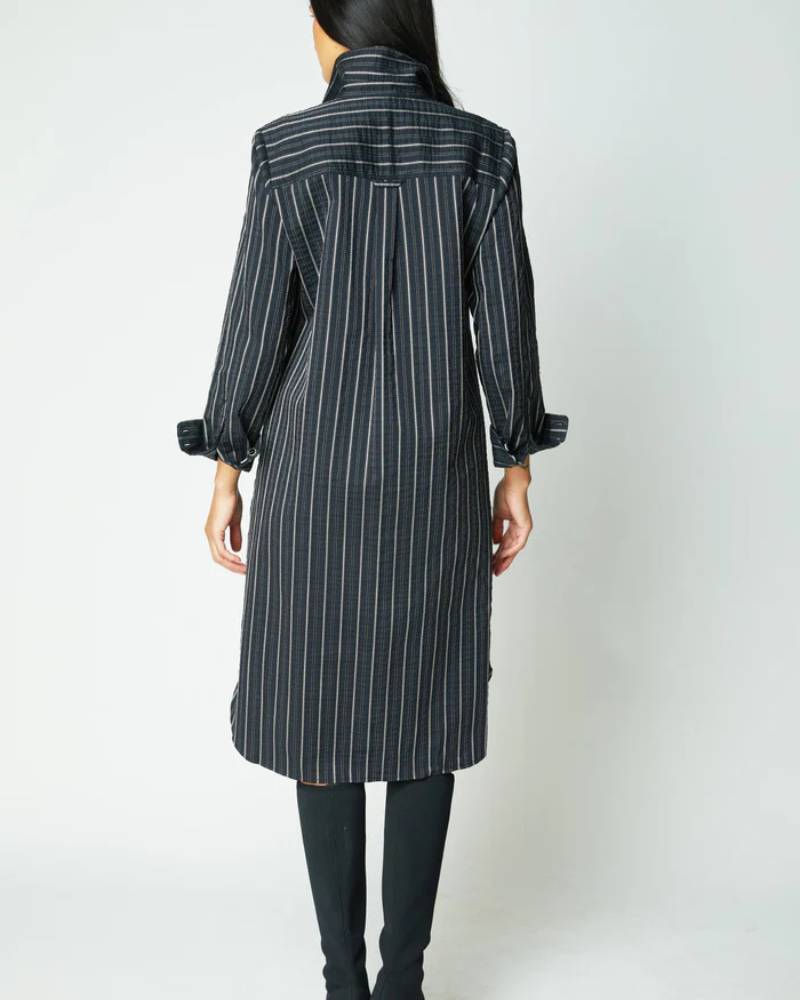 The Eastside Stripe Cafe Dress from Habitat delivers contemporary style with versatile functionality. This black button-up features a striking two-tone jacquard stripe in the season's most coveted silhouette. Crafted from a cotton-spandex blend, the fabric offers natural breathability with gentle stretch for all-day comfort. Practical on-seam pockets, a shirt tail hem, and a subtle back pleat enhance both form and function. Style it belted for definition or wear open as an effortless duster layer. A refined wardrobe essential that transitions seamlessly from day to evening.