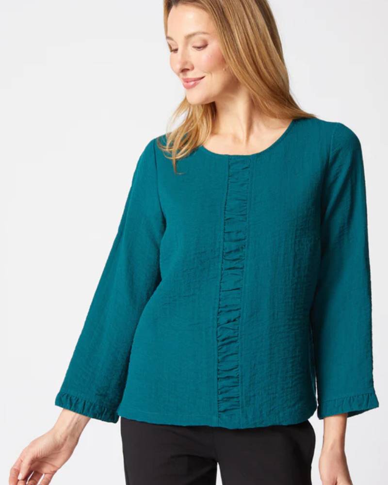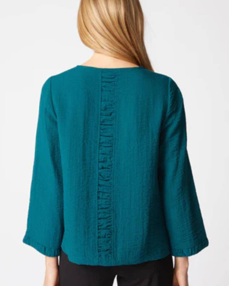 The Express Travel Cindy Top from Habitat combines practicality with effortless style. Crafted from a lightweight rayon and nylon blend, this travel-ready piece features a distinctive crinkle texture that resists wrinkles—ideal for packing. Strategic ruching along the center front, back, and sleeves creates flattering dimension, while the relaxed swing silhouette ensures comfortable movement all day. The sophisticated Juniper hue offers versatile styling options for any occasion. Perfect for travelers and those seeking wrinkle-resistant, packable basics.