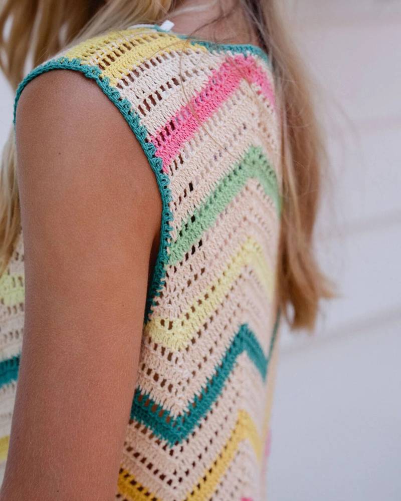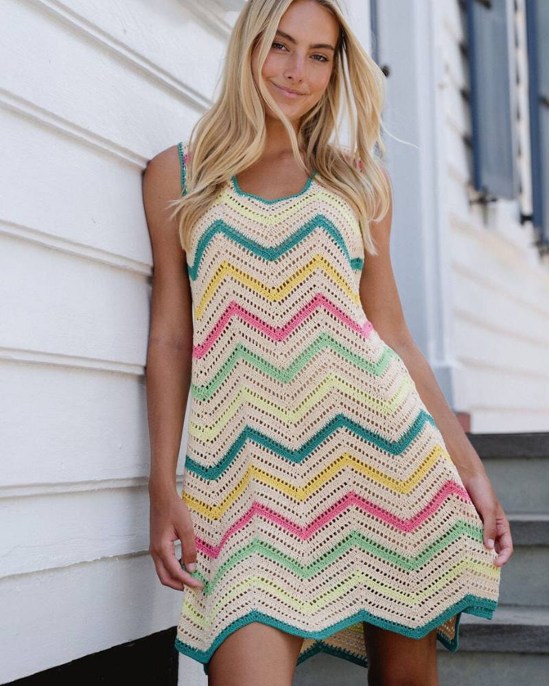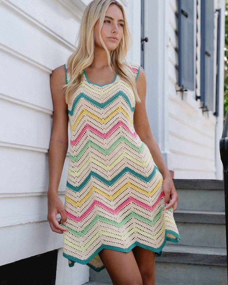 The Jill Crochet Dress from Briton Court is your go-to piece for warm-weather style. This sleeveless crochet knit features a vibrant multicolor zigzag pattern and scalloped hem that brings vintage charm with modern ease. The open-knit construction keeps you cool and breezy, while the scoop neckline and fitted silhouette flatter your frame. Wear it as a dress for casual outings and beach days, or layer it as a chic swim cover-up. Pull-on style with slip included. True to size. Effortless, playful, and perfect for sunshine and weekend adventures.