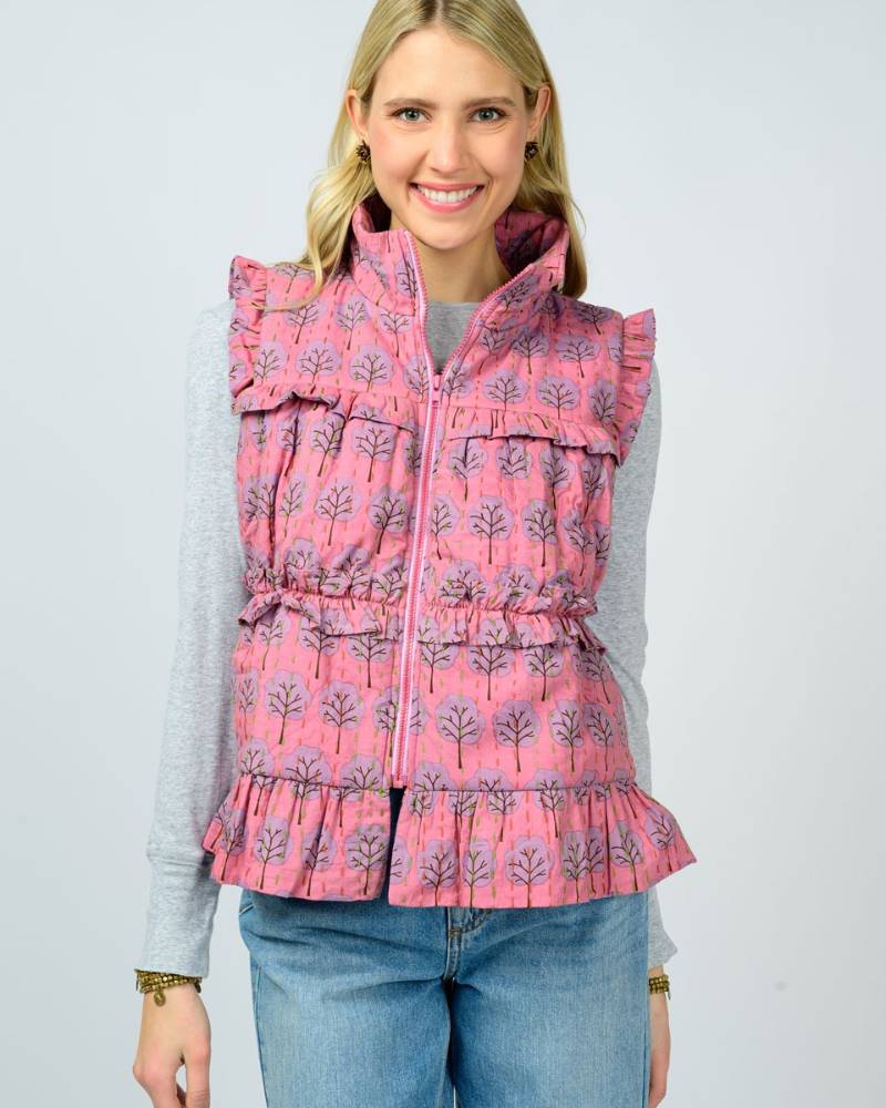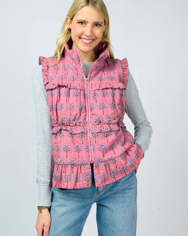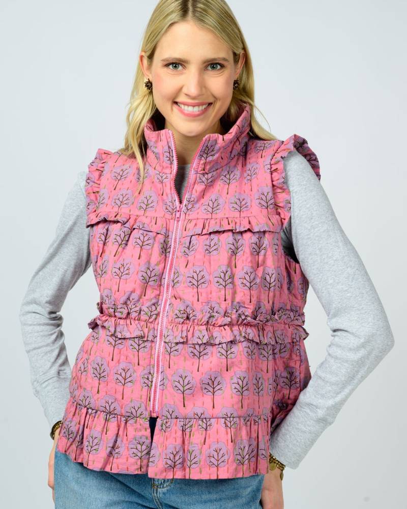 The Kantha Stitched Vest by Ivy Jane showcases traditional craftsmanship with its distinctive multicolored stitching detail set against a soft puffy pink exterior. Constructed from 100% cotton and thoughtfully produced in India, this piece combines comfort with artisanal appeal. The front zipper closure ensures easy layering, while the minimalist design—absent of pockets—maintains clean lines and a refined silhouette. Perfect for those who appreciate quality construction and cultural textile traditions.