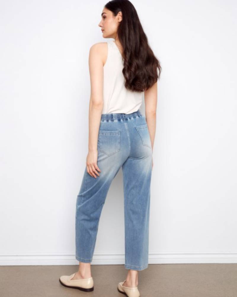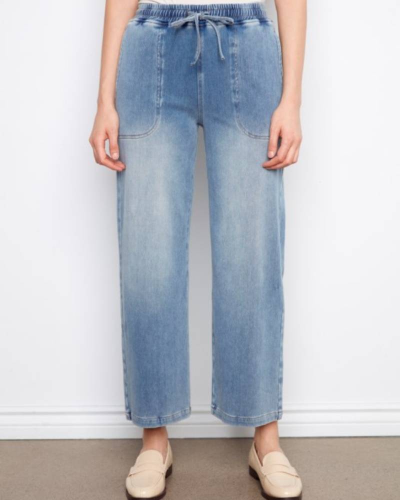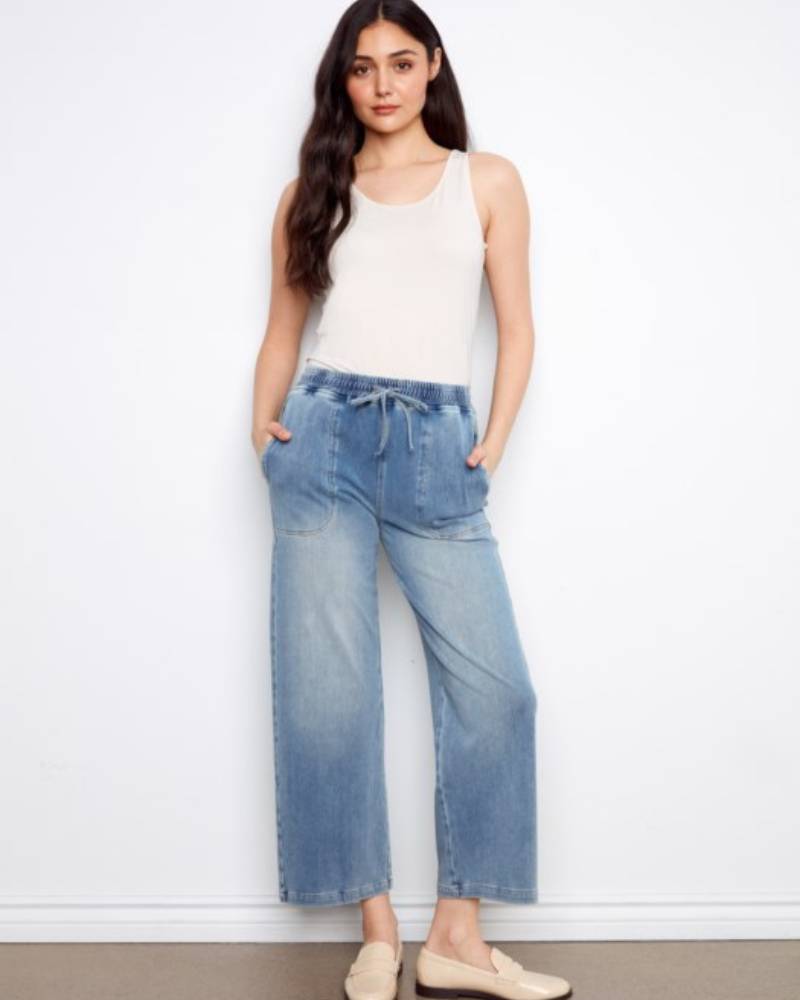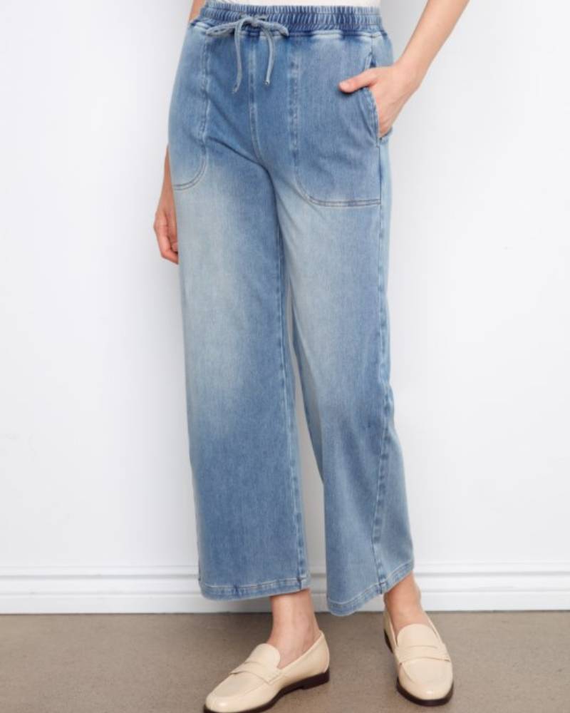 Elevate your loungewear game with these Charlie B. Knit Denim Wide Leg Jogger Pants—where comfort meets style. Crafted from a breathable blend of cotton, Tencel, and spandex, these cropped joggers feature a relaxed wide-leg silhouette with a regular rise and hip slash pockets for everyday ease. The 27-inch inseam and 11-inch leg opening create that perfect laid-back vibe. Gentle care keeps them looking fresh: delicate cold wash, hang dry, and low-heat ironing. Your new favorite pants are here.