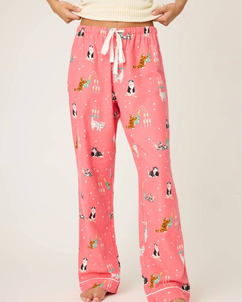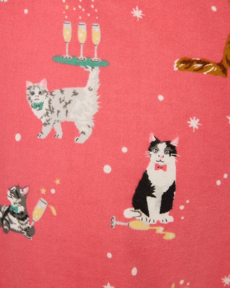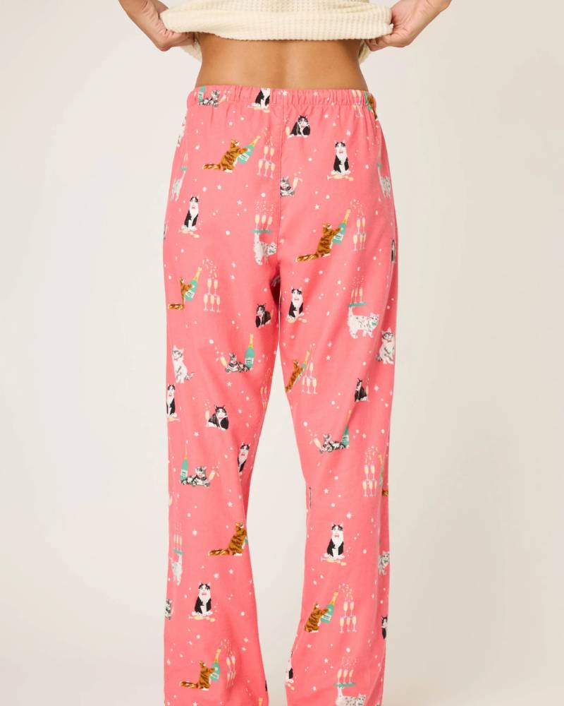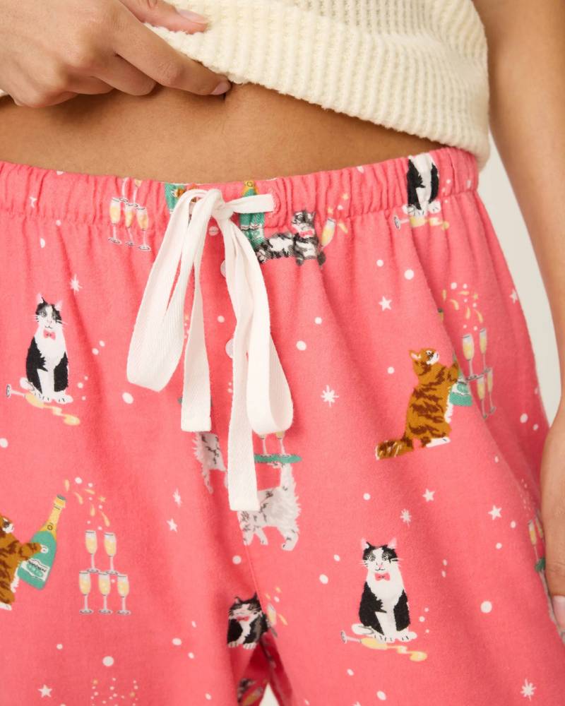 Feel-ine festive in these cat-print flannel pants, crafted from soft cotton twill with a relaxed straight-leg fit. The coral backdrop is covered in cheeky kitties, champagne bottles, and clinking flutes, all finished with a contrast tie waist and piped hems—purr-fect for holiday lounging, bubbly nightcaps, and curling up for a catnap.