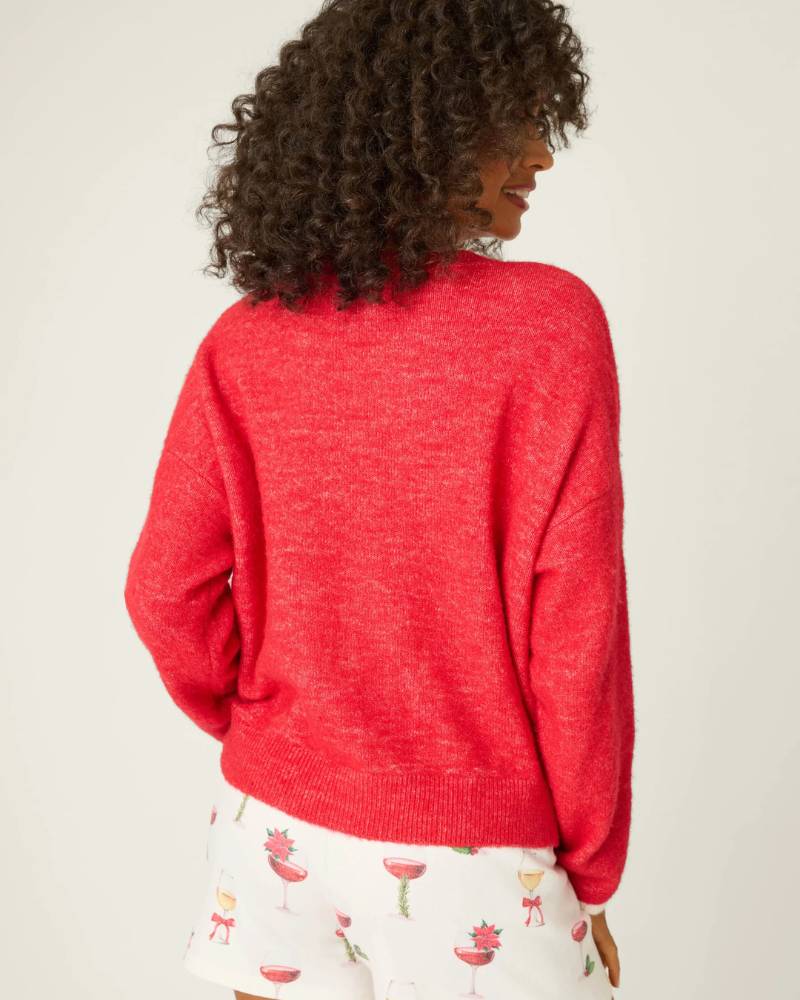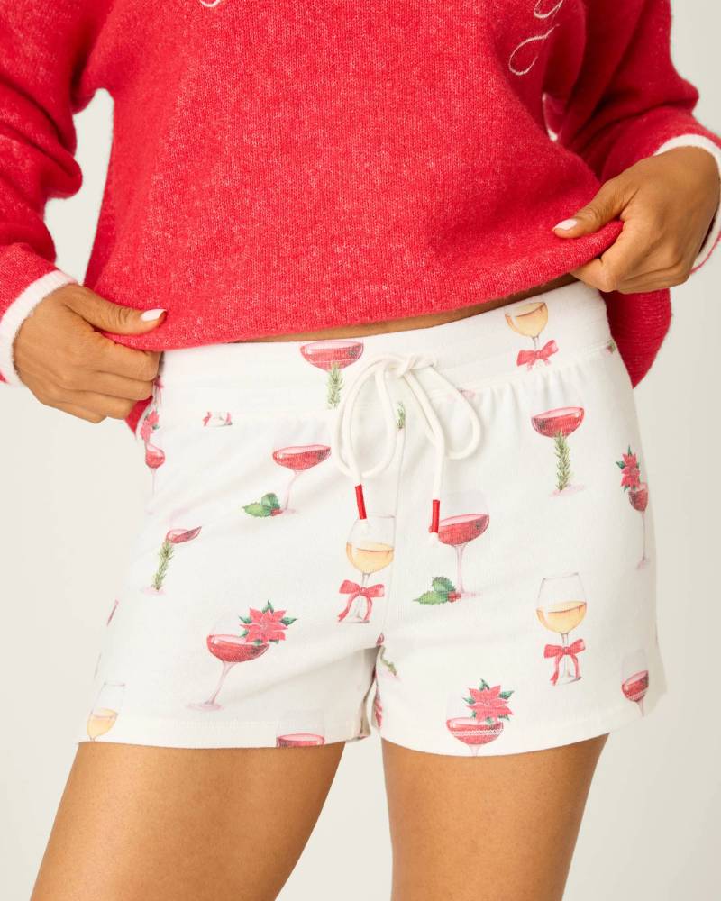 Celebrate the season in style with this cozy two-piece set. The snuggle-worthy red sweater knit top features a bold "let's get toasty" graphic, crew neckline, and ivory cuff accents—perfect for layering with your favorite bottoms. Pair it with the matching ivory pajama shorts, adorned with festive champagne glasses and crafted from soft peachy jersey. With a relaxed fit and adjustable drawstring waist, this set is your go-to for holiday lounging and festive gatherings. Get toasty in comfort and style.