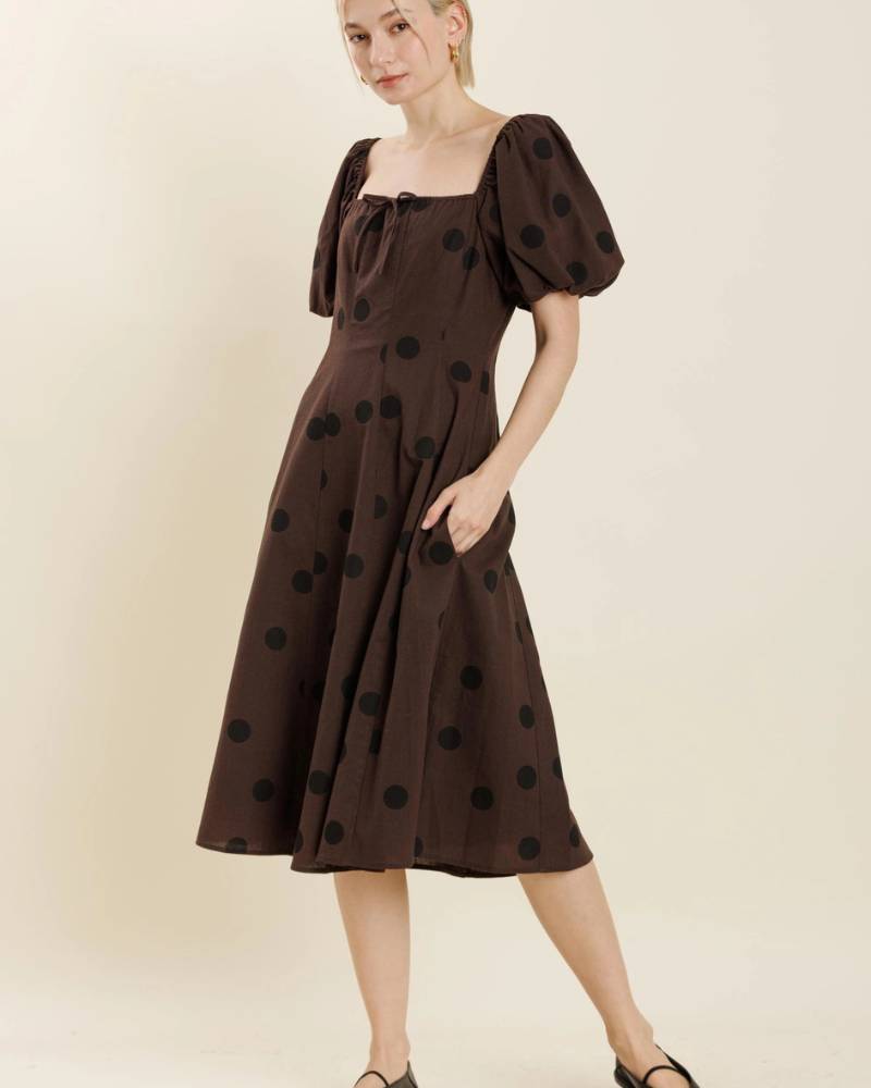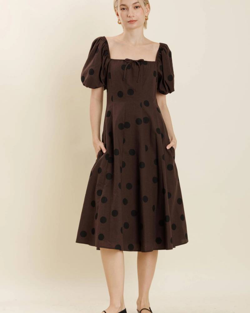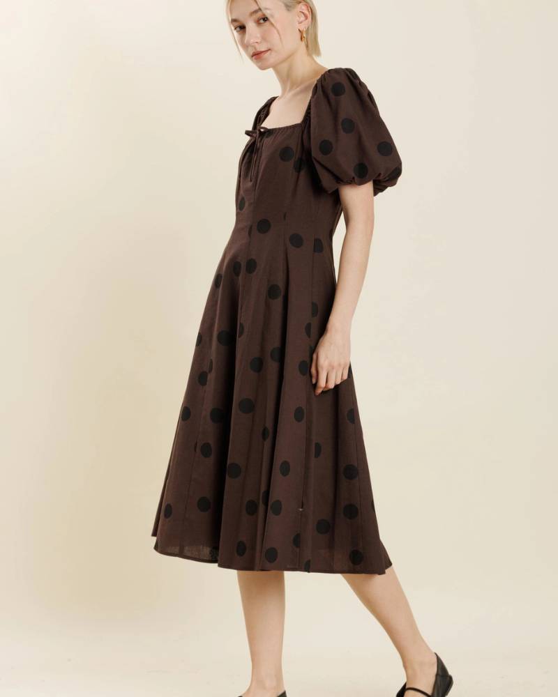Elevate your wardrobe with this sophisticated linen polka dot midi dress from Aureum. The classic brown base with crisp black dots delivers timeless appeal, while the square neckline and charming front tie add refined detail. Designed for comfort and movement, the elasticated smocked back provides gentle stretch where you need it most, and a discreet back zipper ensures an effortless fit. Crafted from a non-stretch linen weave, this piece offers breathable elegance perfect for warm-weather occasions and everyday sophistication.