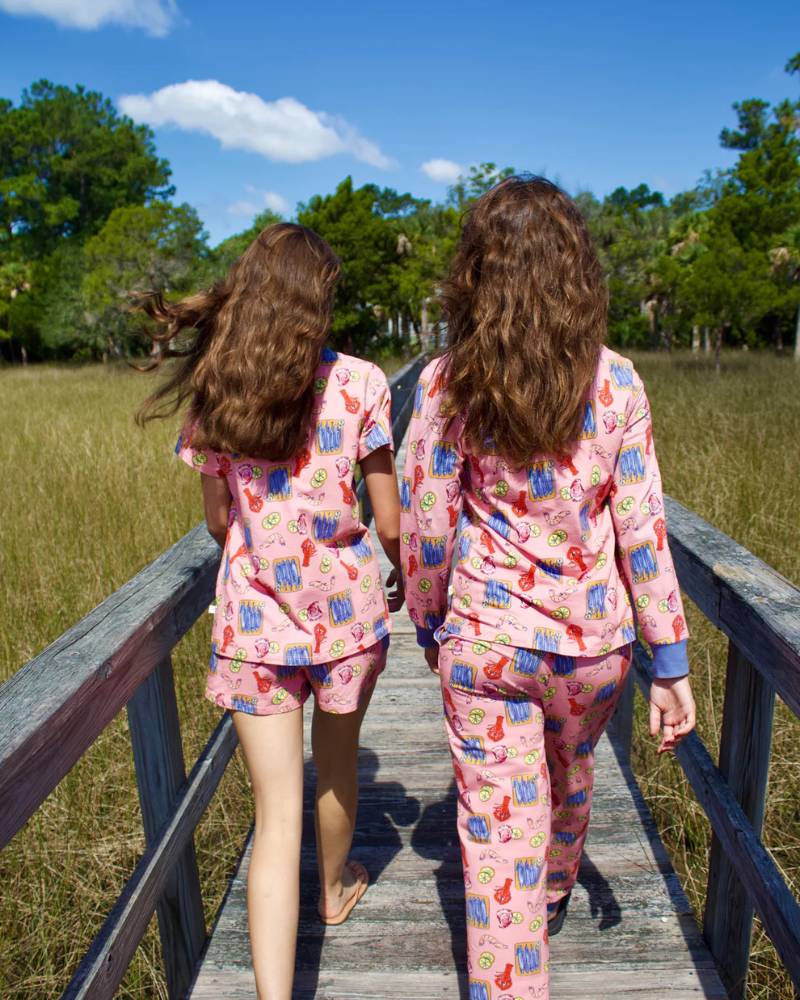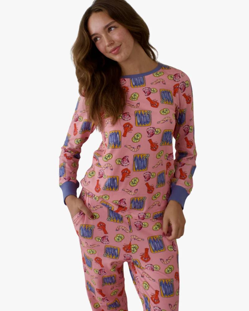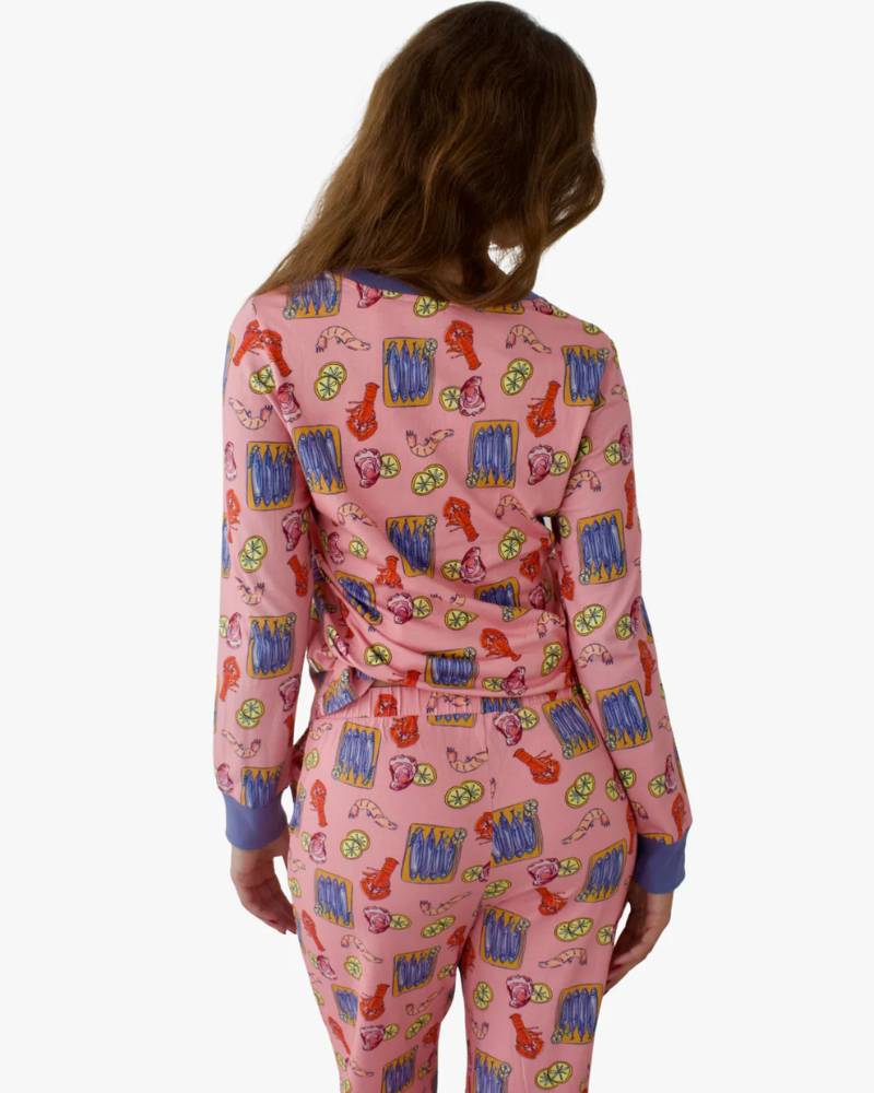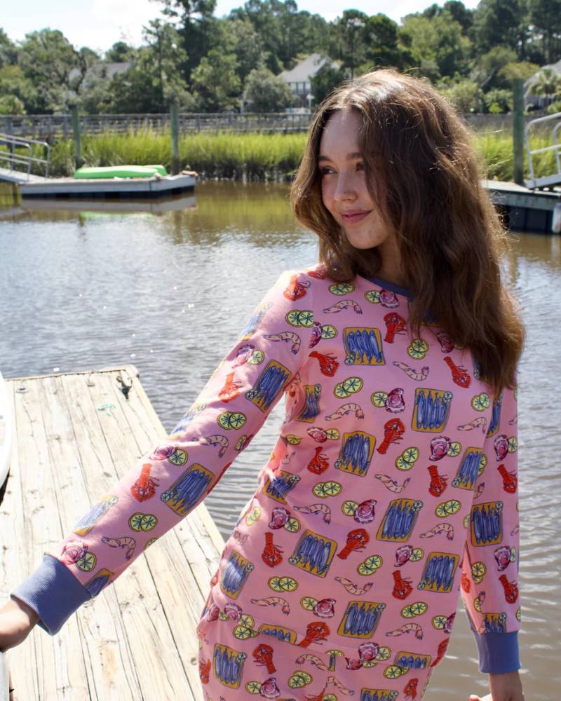 Embrace Southern charm with the Lowcountry Delight Cotton Pant PJ Set, featuring vibrant seafood-inspired artwork by local artist Jessie Reyna. Crafted from brushed organic cotton with subtle stretch, this set delivers exceptional comfort for restful nights. The pants feature functional pockets and contrast ribbed cuffs for refined detail. Each set arrives in a self-fabricated, reusable bag with satin drawstring—perfect for gifting or storage. Experience quality sleepwear that celebrates coastal culture while supporting sustainable, artisan-crafted design.
