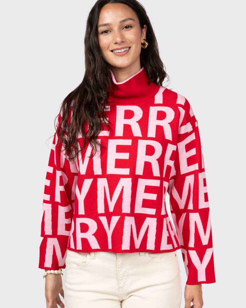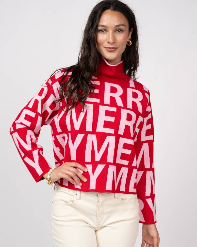 Spread holiday cheer in this delightfully festive red knit sweater! Covered in cheerful "MERRY" text, it's the perfect pick for seasonal celebrations and cozy gatherings. With a generous fit that prioritizes comfort, you'll stay warm and merry all season long. Whether you're heading to a holiday party or keeping things casual, this playful sweater brings instant festive vibes and a smile to everyone around you.