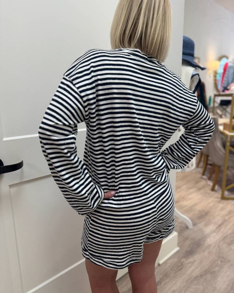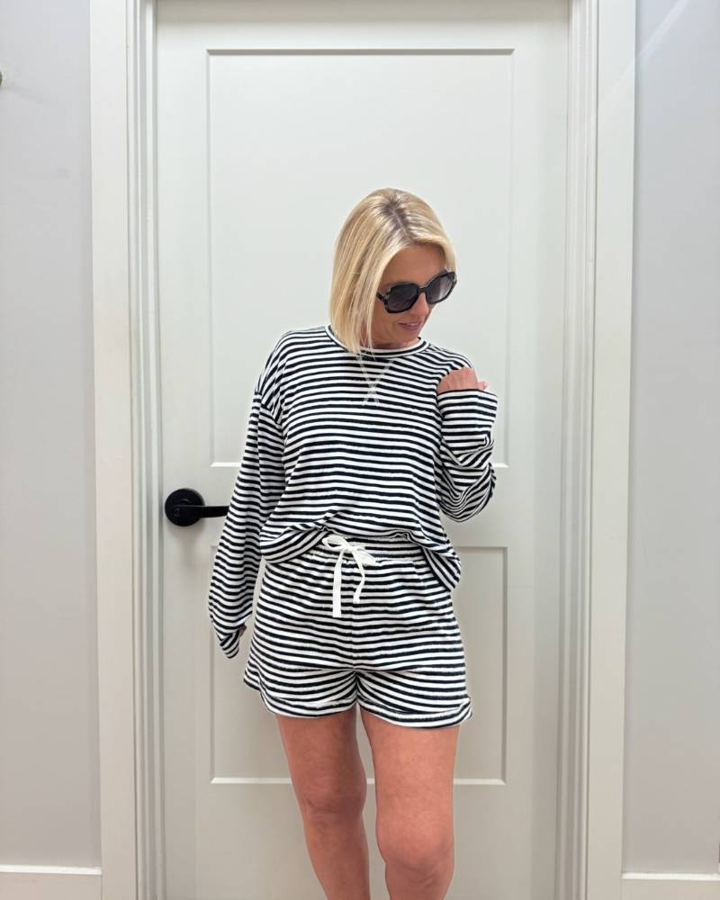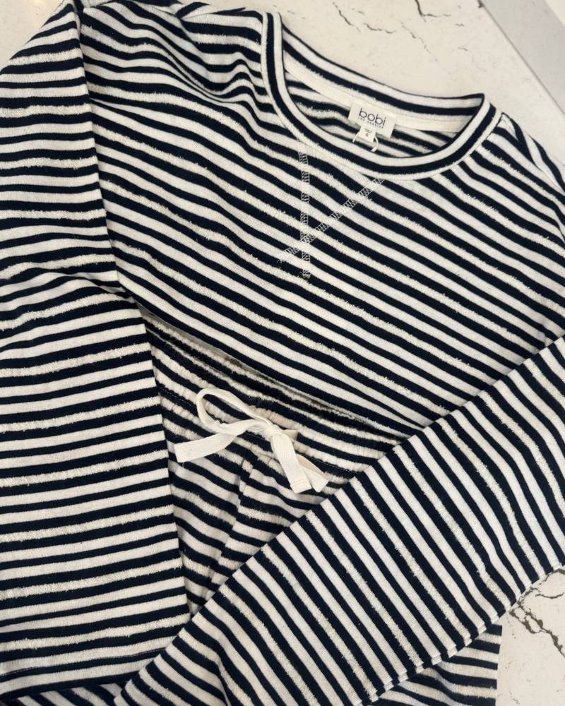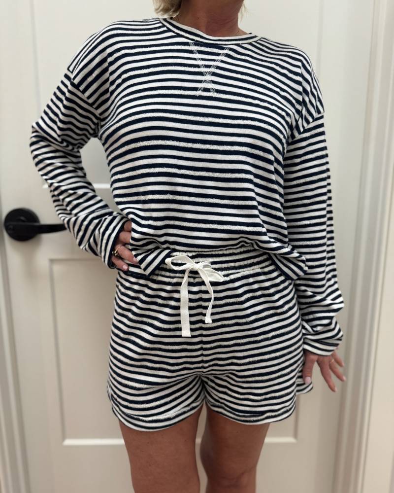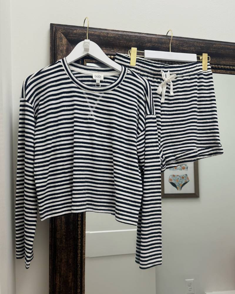 Snuggle into comfort with this adorable navy and white striped shorty set from Bobi! The soft long-sleeve crew neck top blends 70% cotton, 20% acrylic, and 10% nylon for a cozy feel that moves with you. Pair it with the matching shorts featuring a stretchy waistband and drawstring for the perfect lounging or casual day look. True to size and ready to become your new go-to favorite.