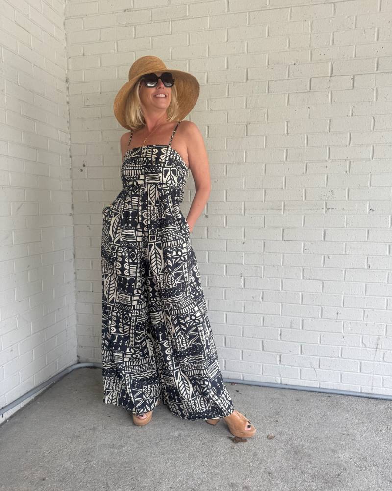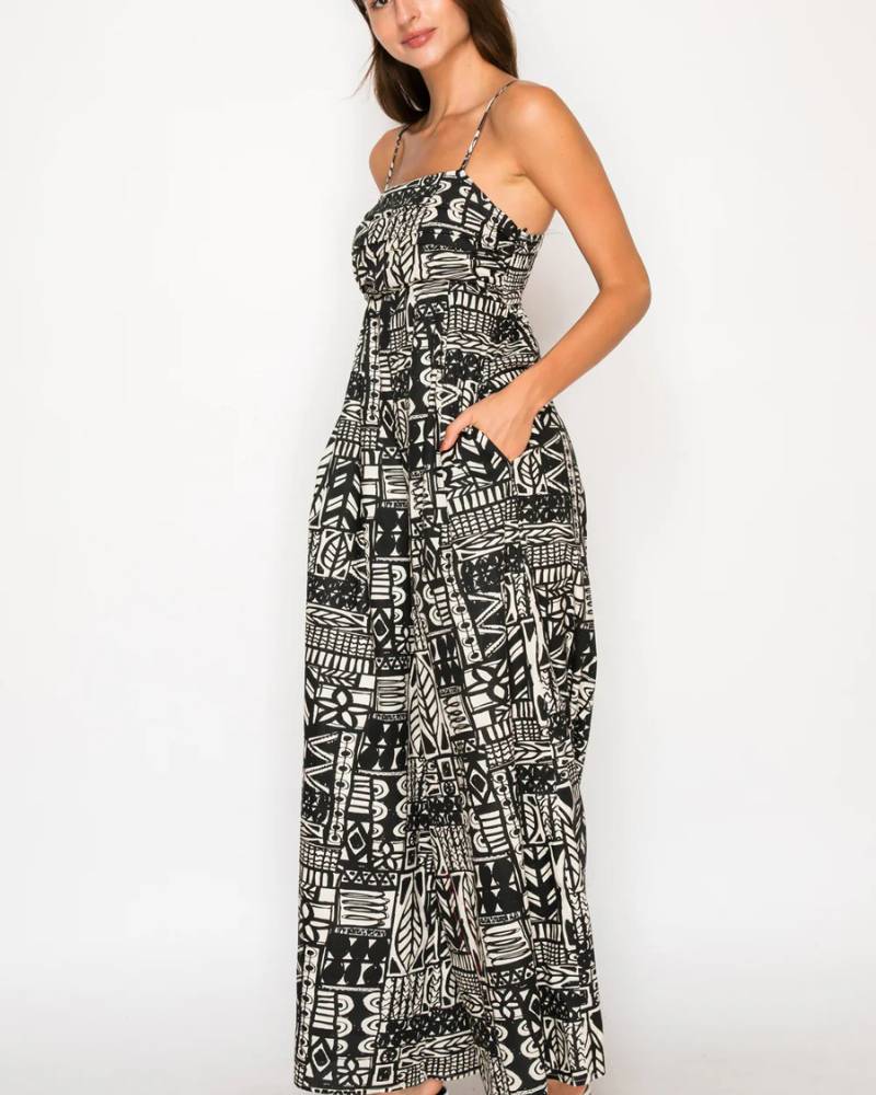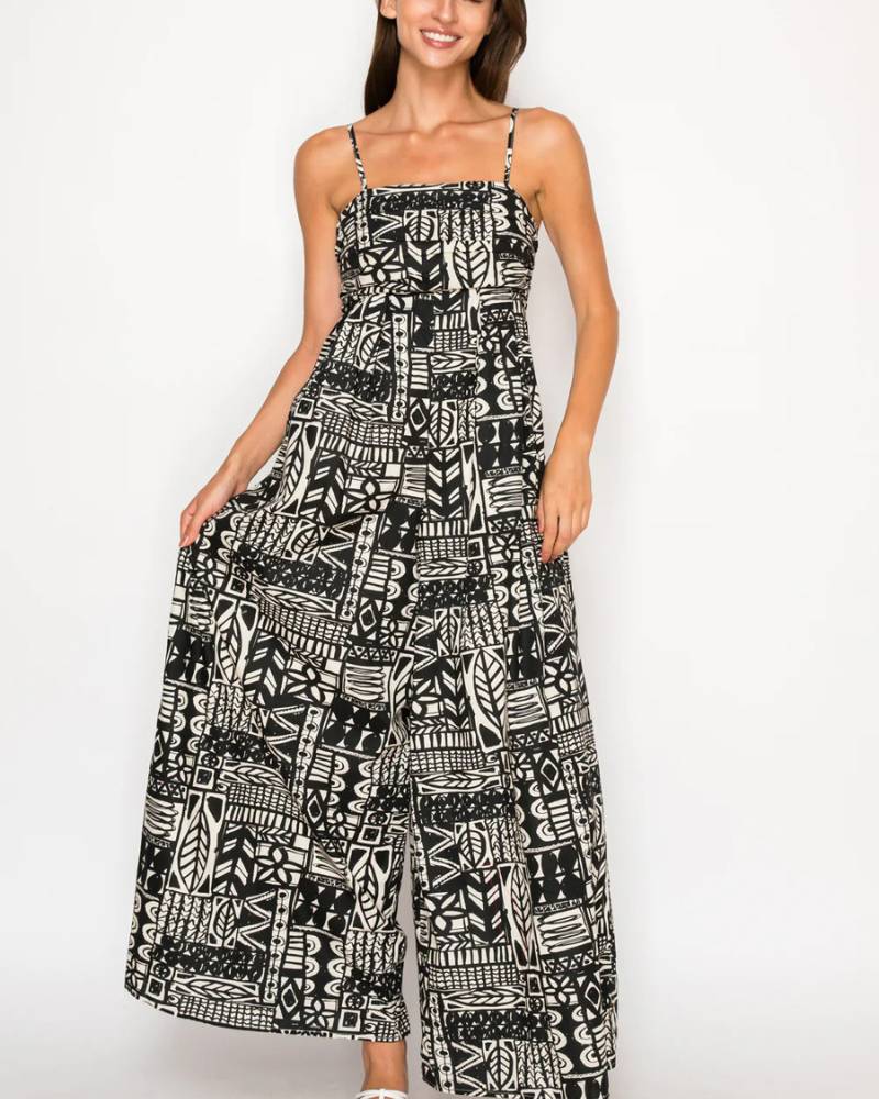 Step into wearable art with the Nysa's Ink Jumpsuit—a show-stopping one-piece from Meet Me In Santorini that marries bold creativity with effortless elegance. This captivating design features a mesmerizing black and cream abstract print that flows from the comfortable smocked bodice down to floor-grazing wide legs, creating the illusion of a graceful maxi skirt. Adjustable straps let you customize the fit while the dramatic silhouette keeps you cool and confident from sunrise to sunset. Perfect for those moments when you want to make a statement without saying a word.