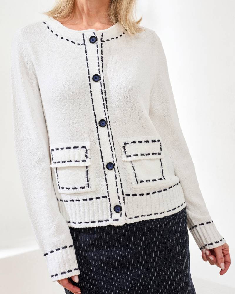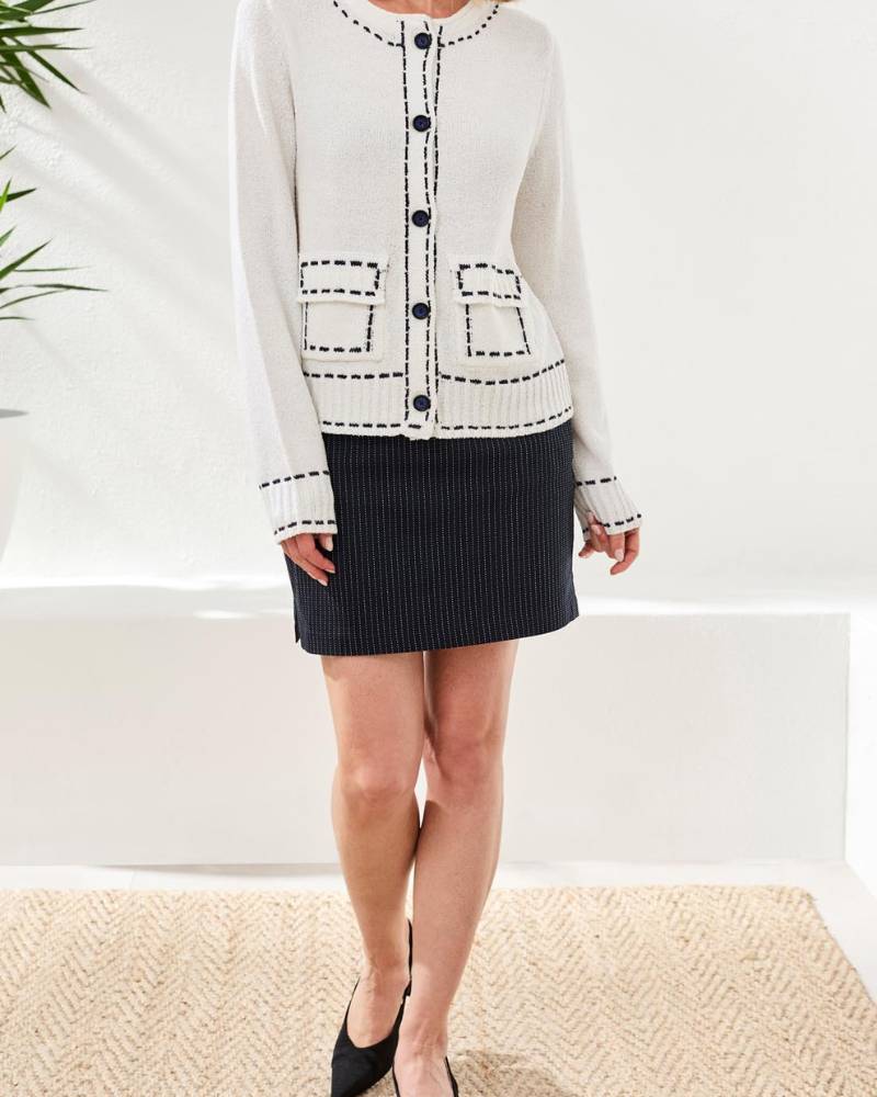 Wrap yourself in cozy charm with this adorable white cardigan from Tribal. Soft, cloud-like fabric pairs perfectly with crisp navy outlining for a timeless two-tone look. The button-up front makes layering effortless, while practical pockets add everyday functionality. Cut to fit true to size, this sweater transitions seamlessly from casual coffee runs to relaxed weekend vibes. Pure comfort meets cute style.