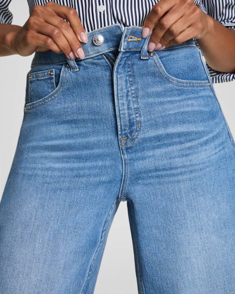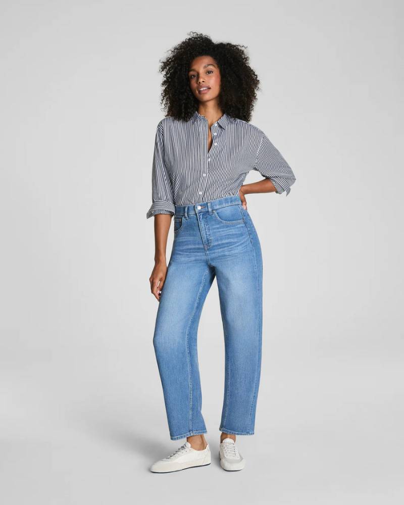 Experience the perfect blend of comfort and confidence with our SPANXshape™ Authentic 360 Barrel Leg Jeans. Crafted from premium 4-way stretch denim, these high-rise beauties feature our signature 360-degree shaping panel that smooths your midsection and cinches your waist, while strategic back smoothing keeps everything in place—no rolling, no folding. The flattering barrel leg silhouette hugs your curves just right, and those cleverly positioned back pockets? They're designed to celebrate what you've got. Complete with authentic denim details—classic zip and button closure, premium hardware, and a timeless 5-pocket design—these are the jeans you'll reach for every single day. Available in stunning Elysian denim.