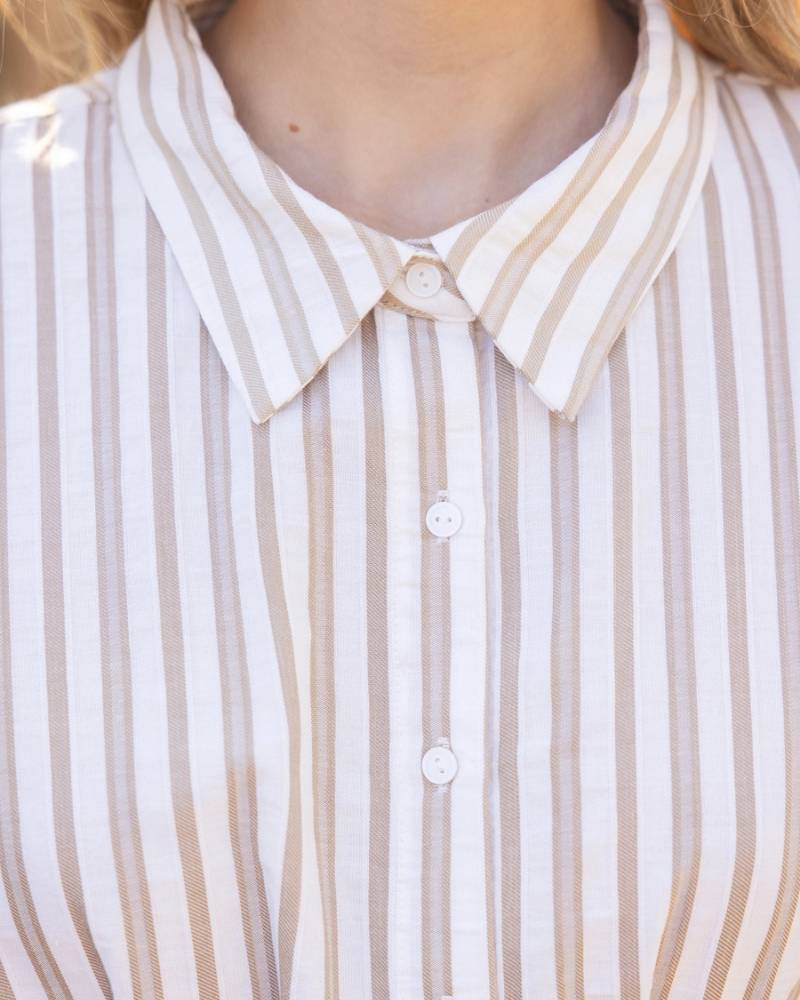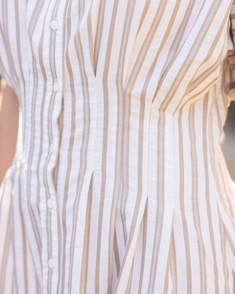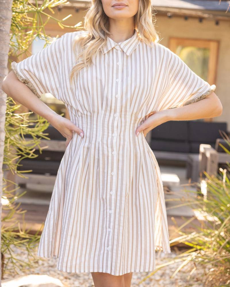 Effortlessly chic and ready for anything, this taupe striped shirt dress is your new warm-weather essential. Featuring a crisp collared neckline, full button-down front, and playful fringed short sleeves, it's designed for those who love easy elegance. The pleated waistline adds subtle dimension while the lightweight woven fabric keeps you cool and comfortable. Perfect for casual outings or dressing up with the right accessories—this versatile piece practically styles itself. From Voy.
