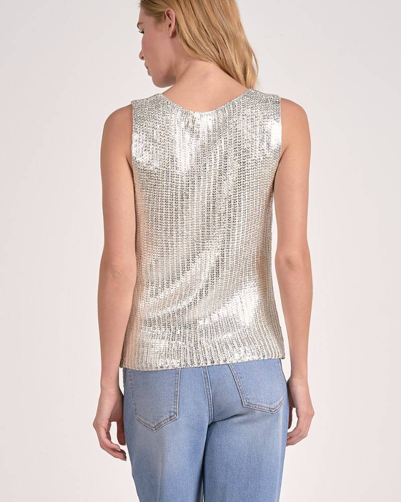 The Raz Sweater from Elan delivers contemporary sophistication through its distinctive metallic knit construction. This sleeveless crewneck piece combines refined minimalism with an unexpected textural element, creating visual interest without sacrificing versatility. The metallic threading catches light beautifully, elevating everyday layering while maintaining a clean, modern silhouette. Perfect for those seeking a statement piece that bridges casual and polished aesthetics.